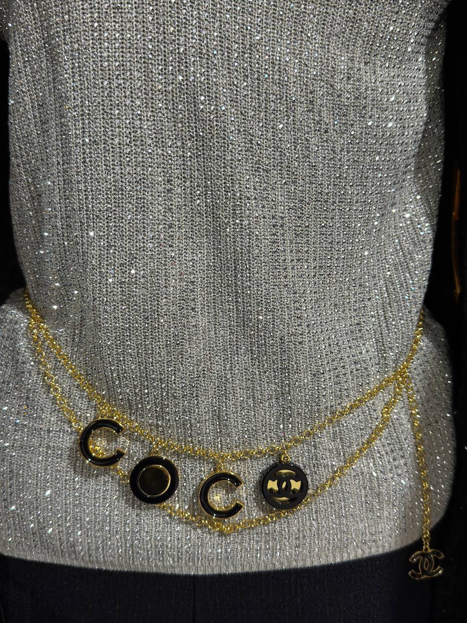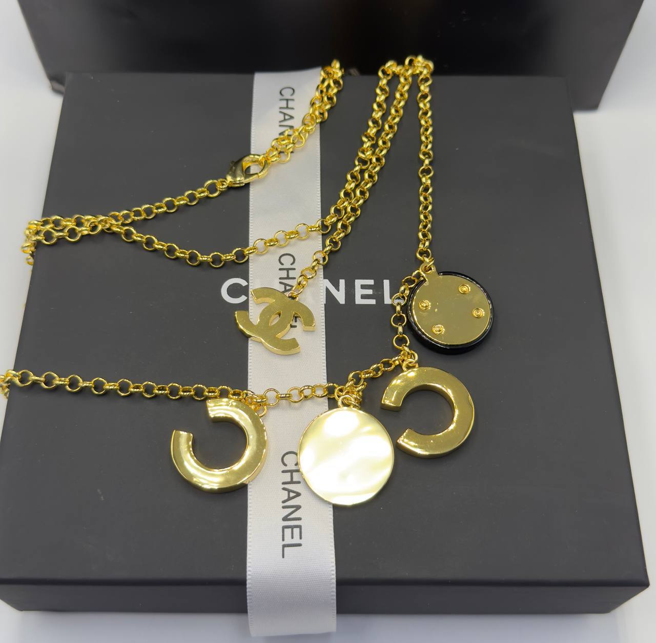 Ожерелье Chanel LUX-114866, представленное на изображении, - это стильное украшение, которое подчеркнет вашу индивидуальность. Золотистое ожерелье дополнено декоративными элементами в виде логотипов бренда и круглых подвесок с черными вставками. Этот аксессуар станет прекрасным дополнением к вашему образу, добавляя нотку элегантности.