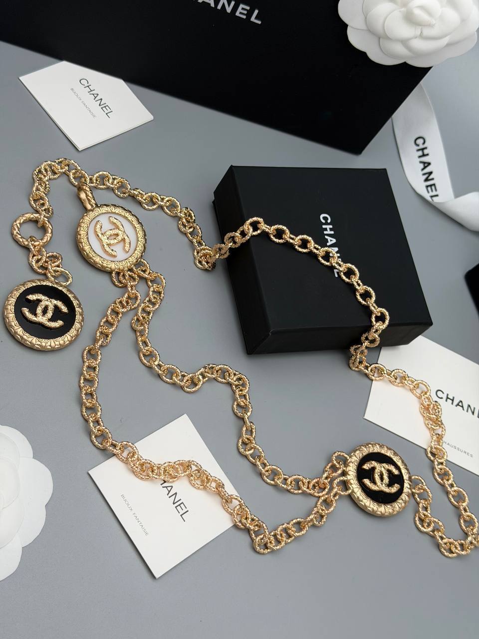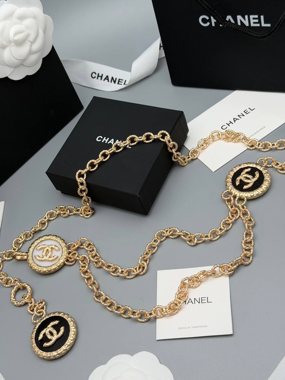 Пояс Chanel LUX-130009 - это стильный аксессуар, который добавит элегантности любому образу. Он выполнен в золотистом цвете и украшен фирменными логотипами бренда.