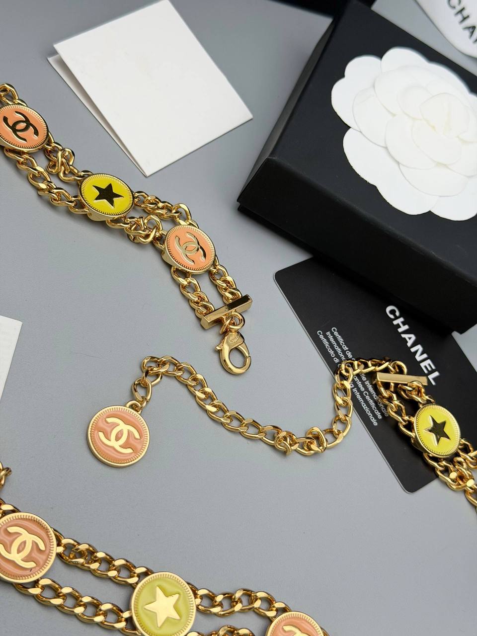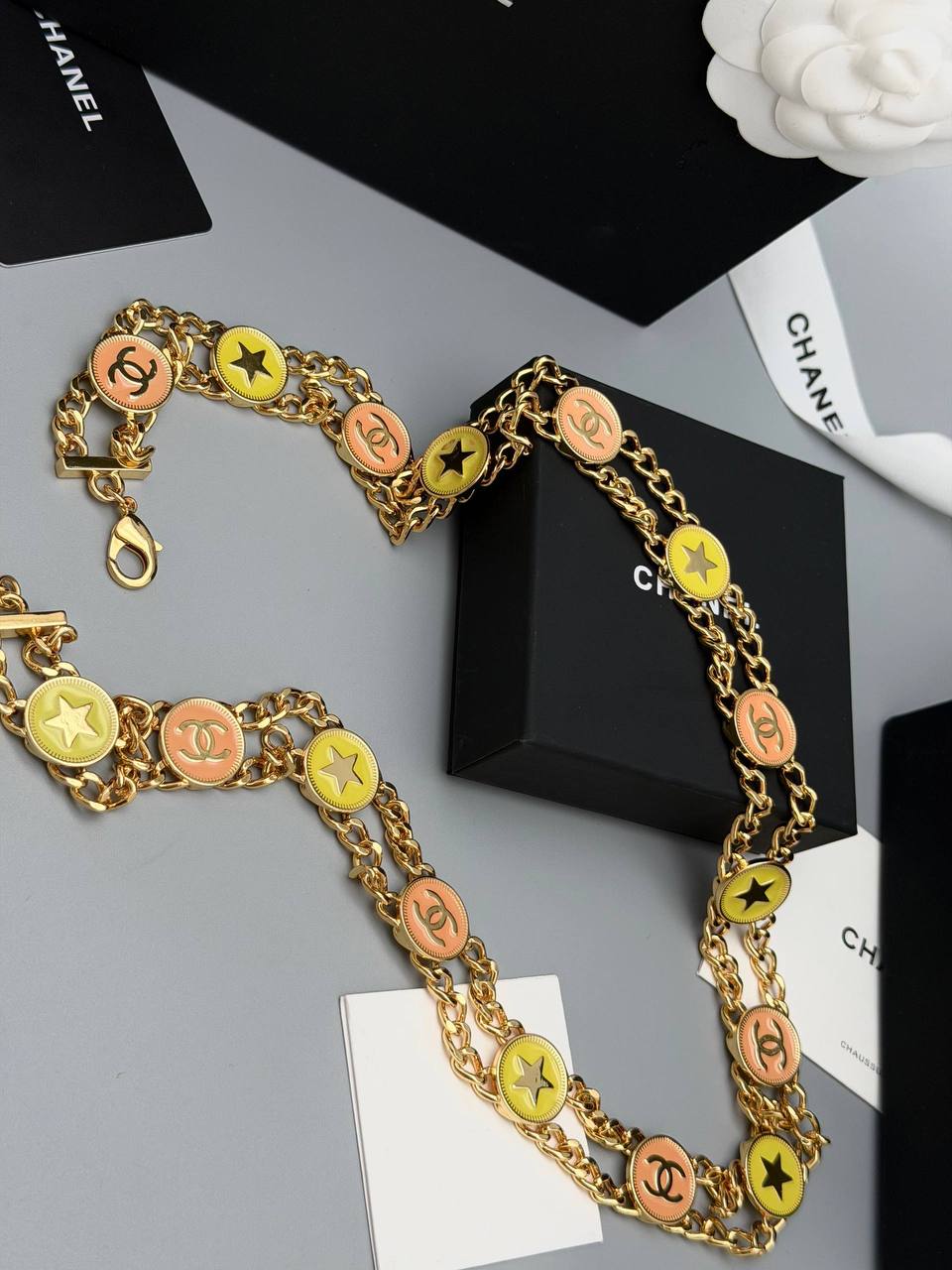 Пояс Chanel LUX-130077 – это стильный аксессуар, выполненный в золотом цвете с декоративными элементами. Он подчеркнет ваш образ и добавит элегантности.