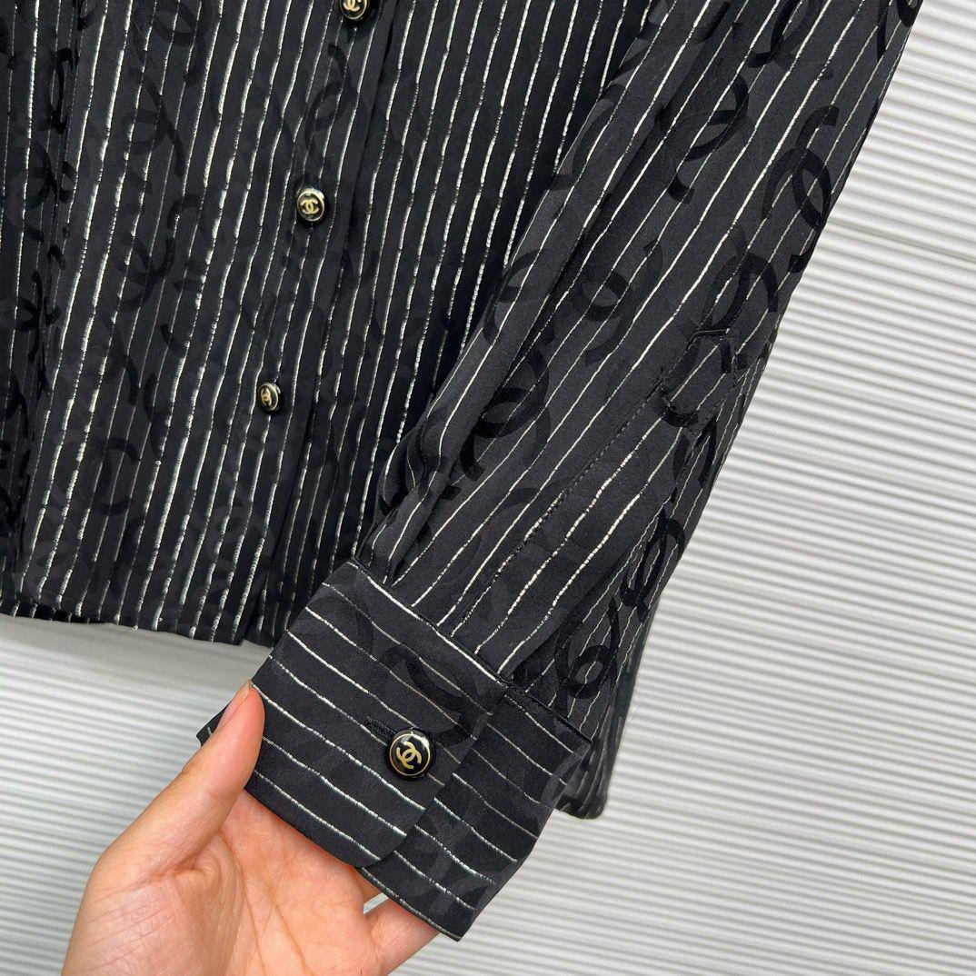 Рубашка Chanel LUX-114908 представляет собой стильную рубашку с длинными рукавами, выполненную в классическом стиле. Она выполнена в черном цвете с вертикальными полосами золотистого цвета, что придает ей элегантный и изысканный вид. Рубашка может быть отличным вариантом для создания как повседневных, так и более формальных образов.
