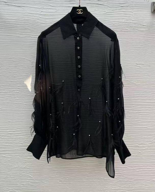 Рубашка Chanel LUX-116116 – это элегантный предмет гардероба от известного бренда, сочетающий в себе утонченность и современный стиль. Рубашка черного цвета, украшена перьями и стразами, идеально подходит для создания изысканных образов. Она будет уместна как для повседневной носки, так и для особых случаев.