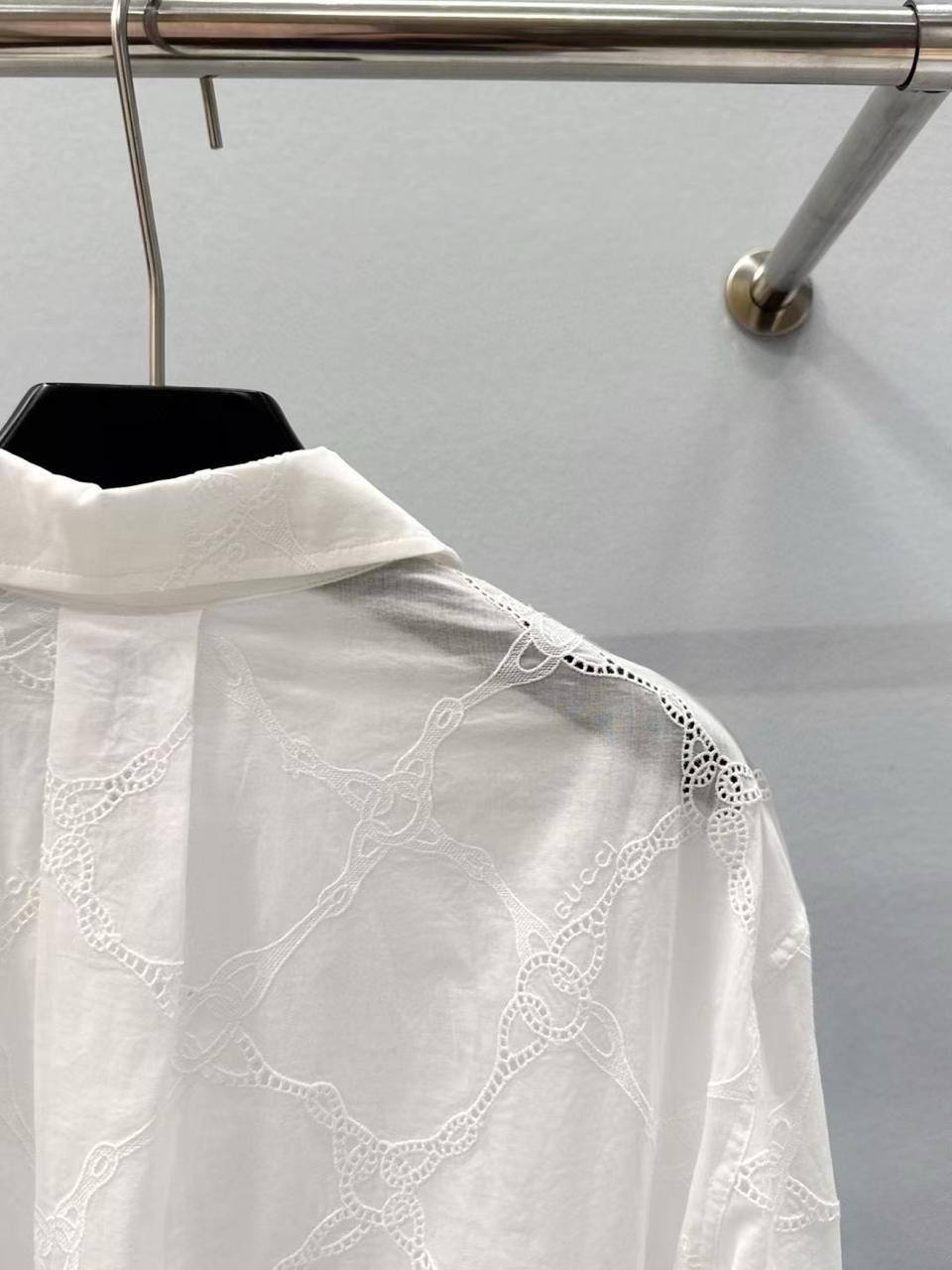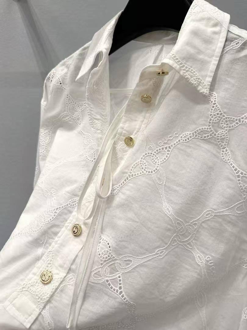Рубашка Chanel LUX-116525 представляет собой элегантную модель в классическом стиле, выполненную в белом цвете. Дизайн рубашки предполагает длинные рукава и воротник с золотистыми пуговицами. Ткань, из которой изготовлена рубашка, имеет красивый узор.
