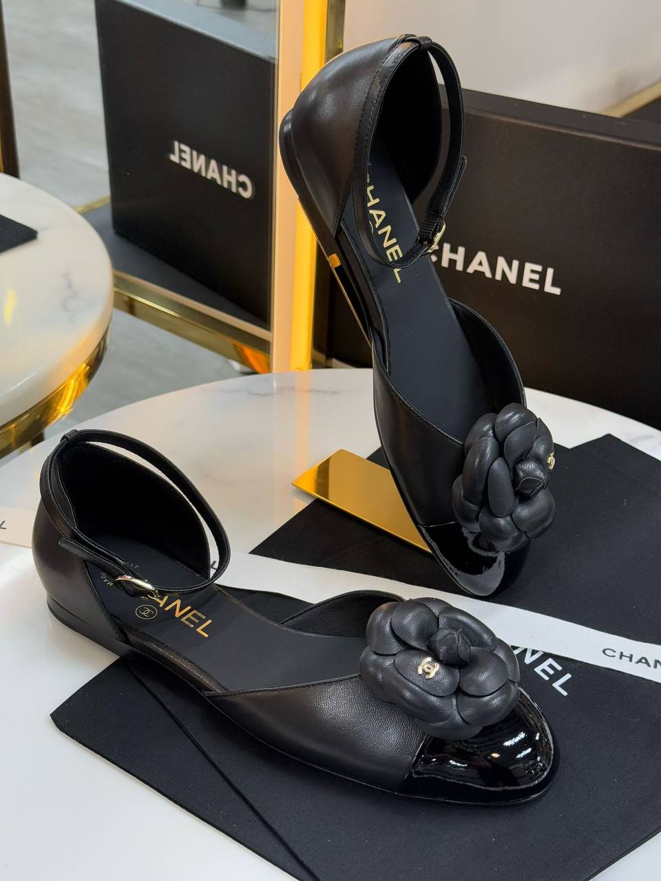 Сандалии Chanel, представленные на изображении, выполнены в элегантном черном цвете с лакированными вставками на мыске. Мягкий кожаный верх дополнен декоративным цветком, добавляющим изысканности. Идеально подойдут для создания стильного и женственного образа.