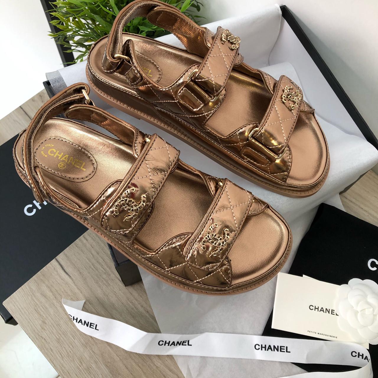 Эти женские сандалии Chanel LUX-48531 выполнены в утонченном бронзовом оттенке, демонстрируя элегантность и узнаваемый стиль бренда. Дизайн сочетает в себе гладкие лакированные элементы с прострочкой, напоминающей стеганую кожу, и украшен фирменными логотипами Chanel. Модель идеально подойдет для создания роскошных летних образов, добавляя изысканности как к повседневному, так и к вечернему наряду.