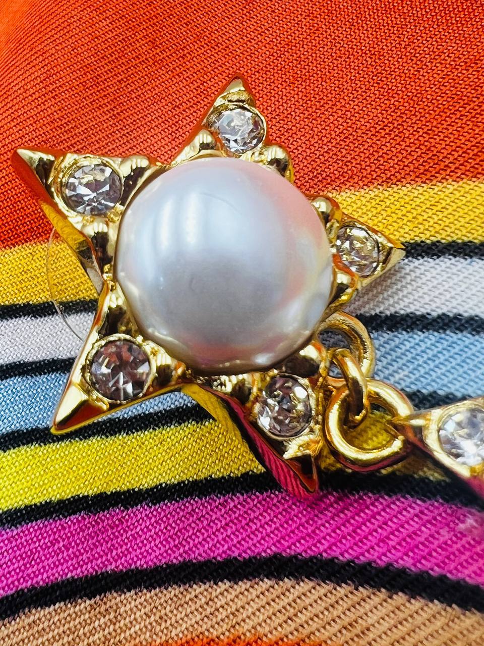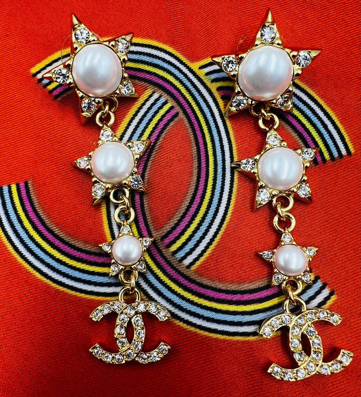 Серьги Chanel LUX-105235 - это изысканное ювелирное украшение, которое подчеркнёт элегантность и неповторимость стиля своей обладательницы. Серьги выполнены в золотистом цвете, их дизайн включает в себя жемчужины, звёзды и логотип бренда, декорированные стразами. Этот аксессуар станет прекрасным дополнением к вечернему образу или же повседневной элегантности.