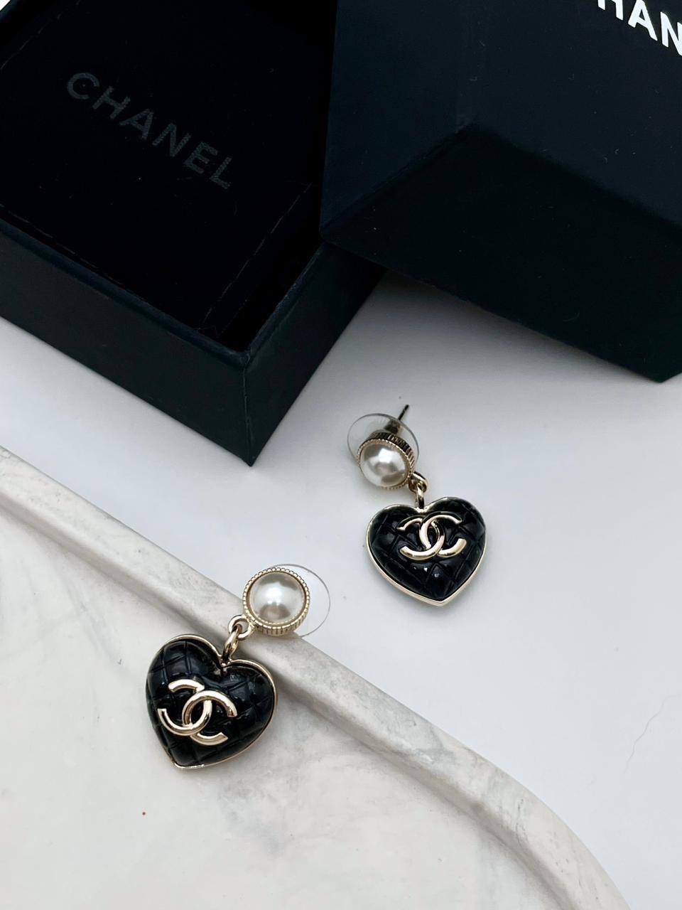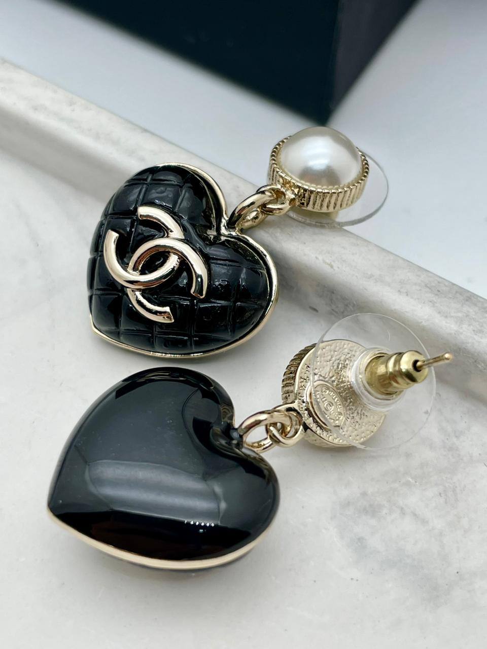 Серьги Chanel LUX-106846 – это элегантное украшение в виде серег-подвесок с акцентом на узнаваемом дизайне бренда. Они выполнены в форме сердечек черного цвета, декорированы знаковым логотипом и дополнены жемчужинами. Эти серьги подойдут для создания изысканных образов.