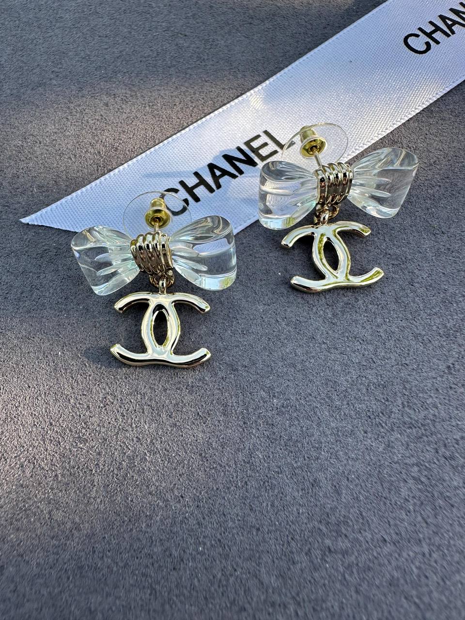Серьги Chanel LUX-119726 – это изысканное украшение, сочетающее в себе элегантность и современный дизайн. Серьги выполнены в виде прозрачных бантов, дополненных подвесками с логотипом бренда. Золотистый цвет деталей придает им роскошный вид, что делает их идеальным аксессуаром для любого случая.