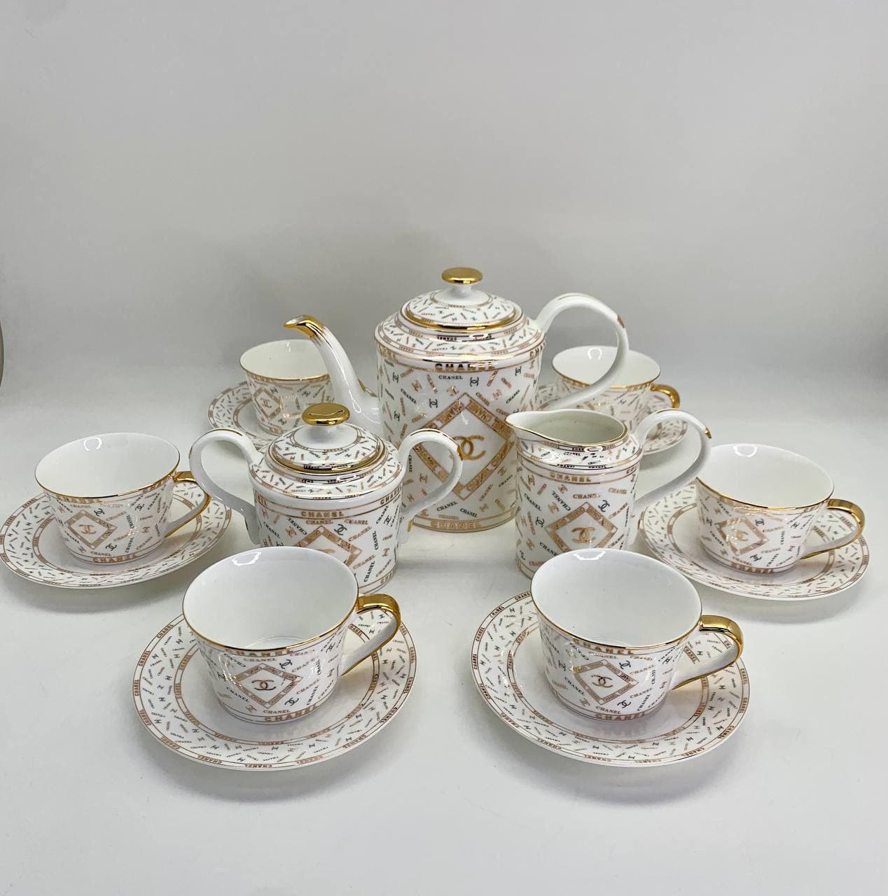 Сервиз Chanel LUX-56832 представляет собой роскошный набор для чаепития, выполненный в элегантном стиле. Белоснежная керамика украшена узнаваемым логотипом Chanel и золотистым узором, создавая изысканный и утонченный образ. Этот сервиз станет настоящим украшением любого стола и добавит нотку роскоши в повседневные или праздничные моменты.