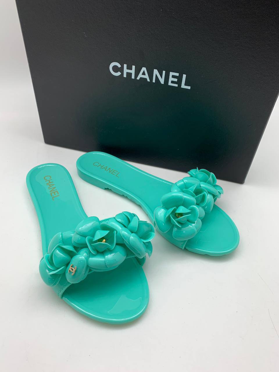 Шлёпанцы Chanel LUX-48296 представляют собой элегантную летнюю обувь, выполненную в ярком бирюзовом цвете. Дизайн украшен объемными цветочными аппликациями и фирменным логотипом бренда, что подчеркивает их эксклюзивность. Эти шлепанцы идеально подойдут для создания стильных и непринужденных образов в теплое время года.