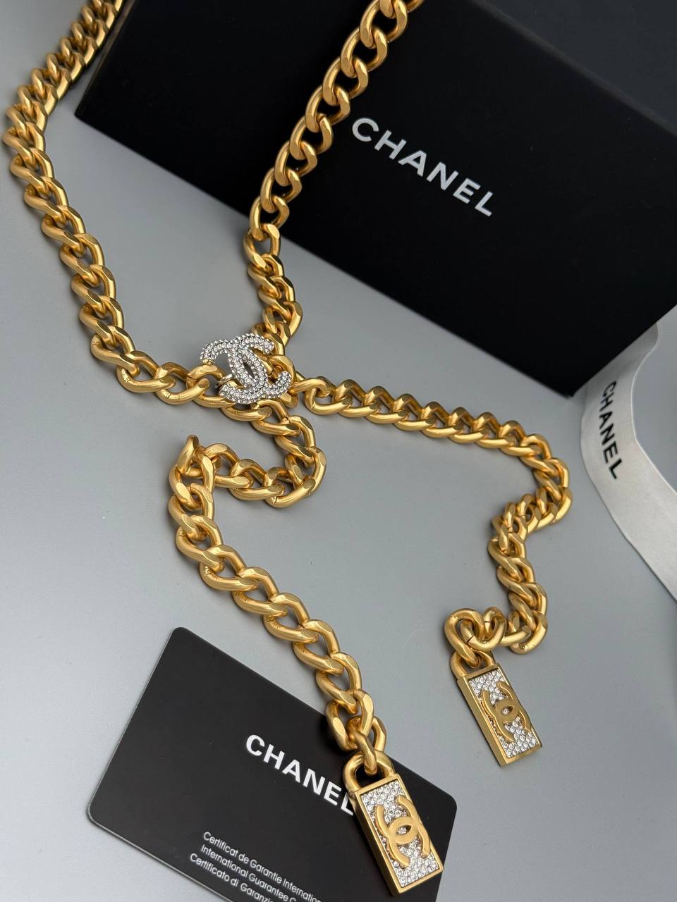 Сотуар Chanel LUX-124525 – это элегантное украшение в стиле бренда Chanel. Массивный золотой сотуар с подвесками в виде логотипа Chanel, инкрустированного стразами, придаёт образу роскоши и изысканности.