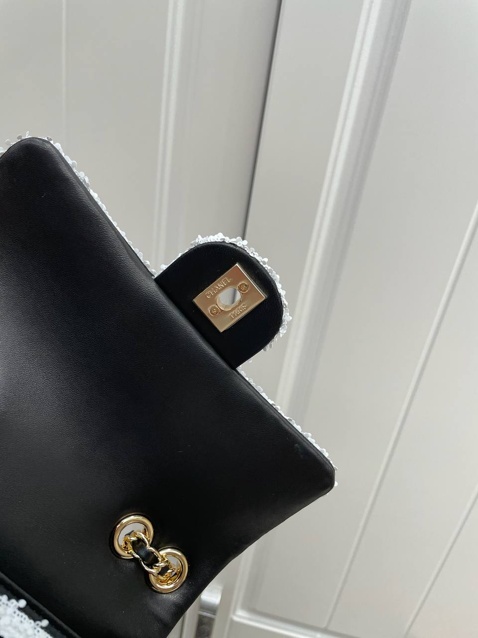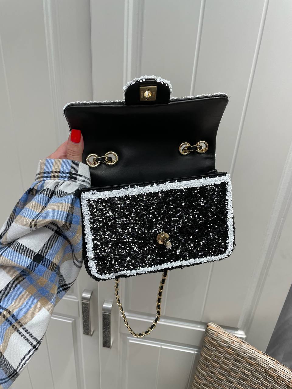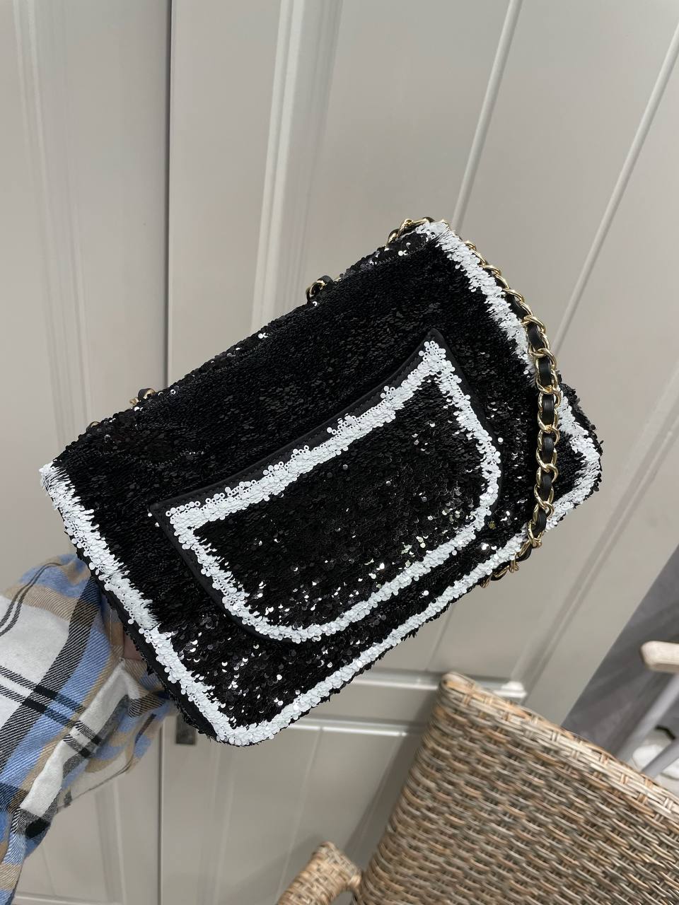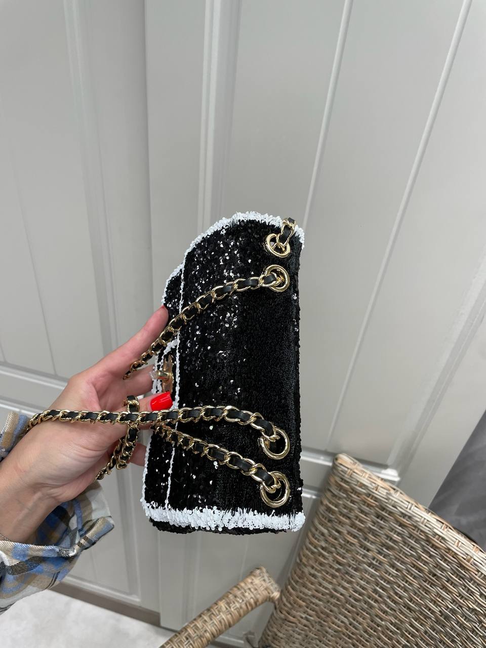 Сумка-конверт Chanel LUX-118865 – это стильный аксессуар от известного бренда, выполненный в элегантном дизайне. Чёрный цвет сумки с блестящей текстурой, подчеркнут белой окантовкой, и золотой цепочкой, идеально подходит для вечерних выходов и торжественных мероприятий, добавляя образу изысканности.