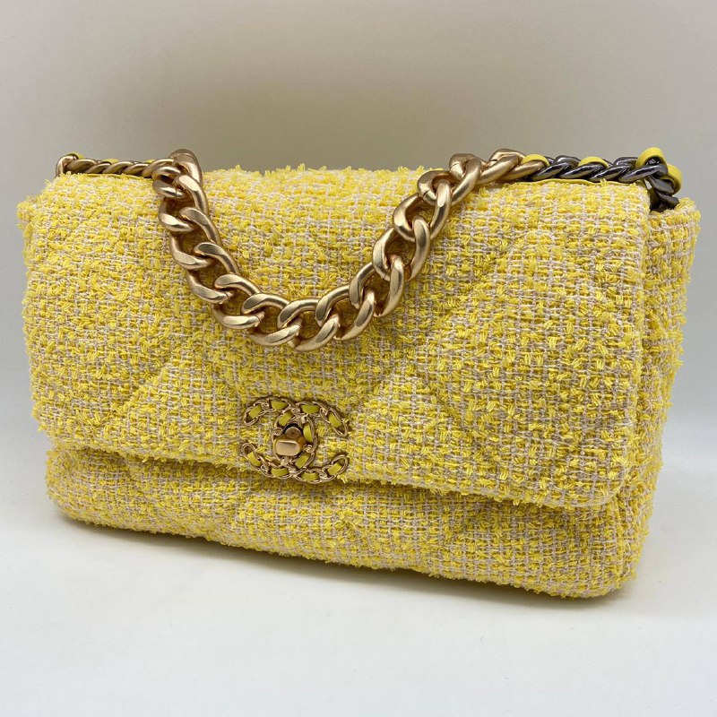 Сумка-конверт CHANEL 19 Chanel LUX-50120 представляет собой стильный аксессуар, выполненный в характерном для бренда элегантном стиле. Сочетание яркого желтого цвета с объемной текстурой ткани и золотистой фурнитуры придает изделию роскошный вид. Эта модель идеально подойдет для создания запоминающихся образов, подчеркивая индивидуальность владельцы.