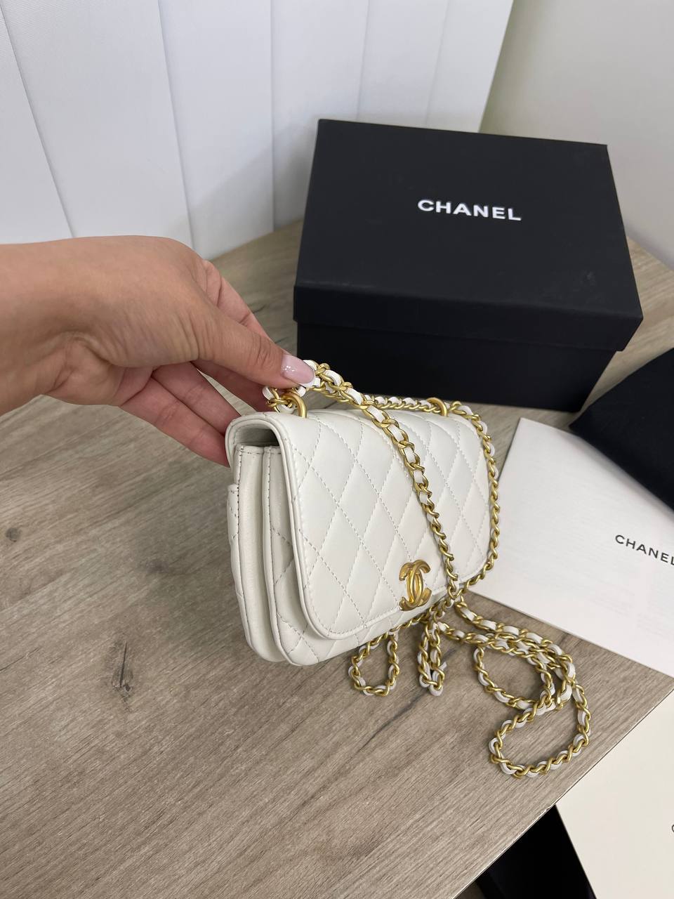 Сумка женская Chanel LUX-93223 — это элегантный аксессуар в классическом стиле. Она выполнена в белом цвете с характерной стёжкой и золотистой цепочкой. Такая сумка подойдет для создания как повседневных, так и вечерних образов.