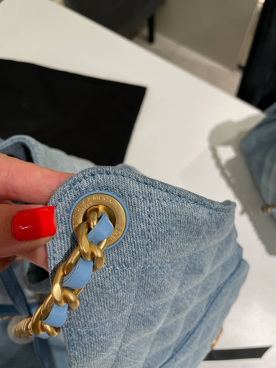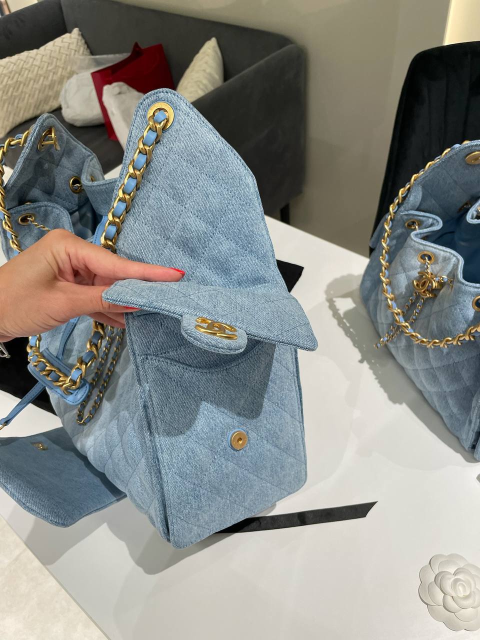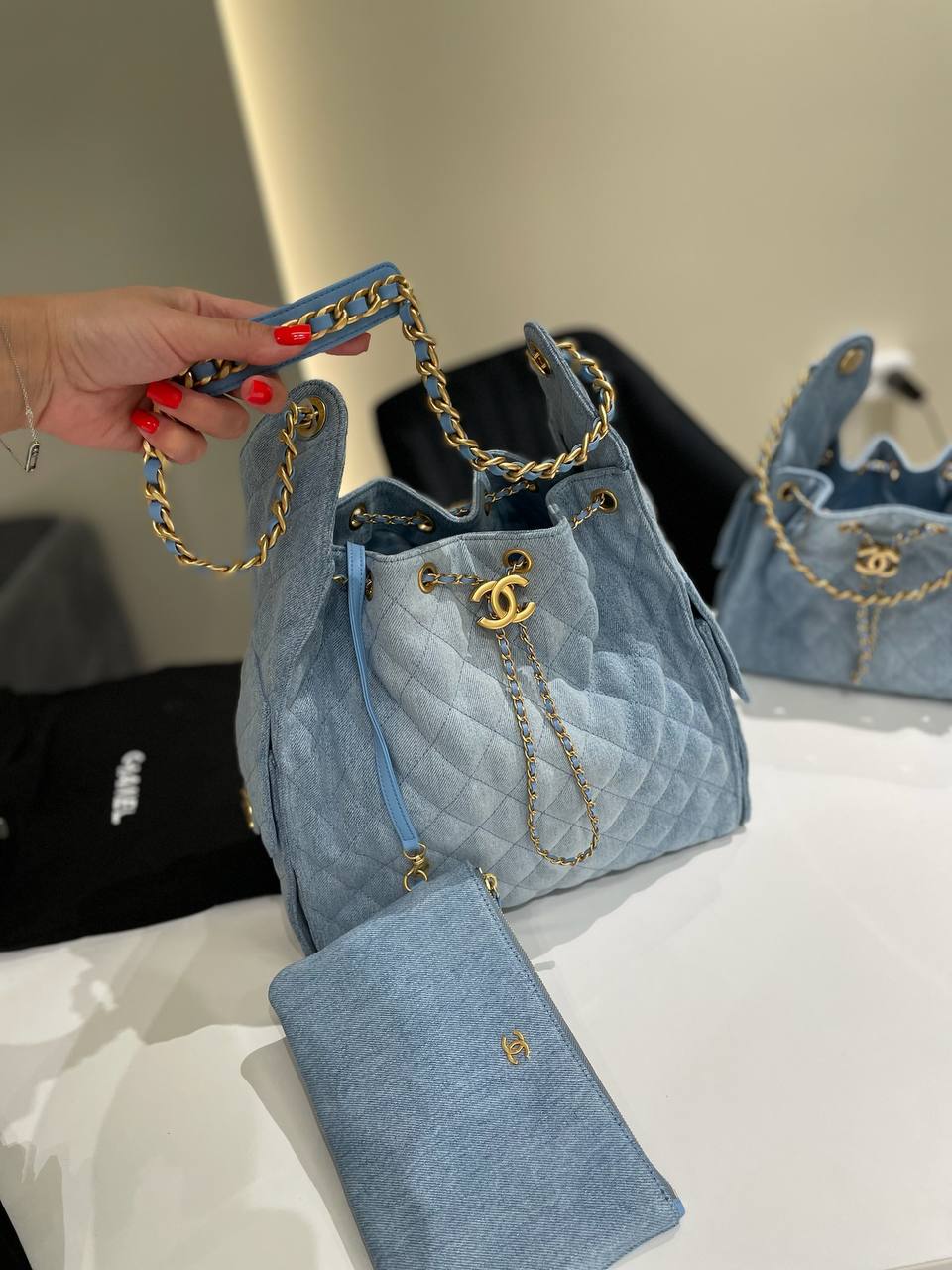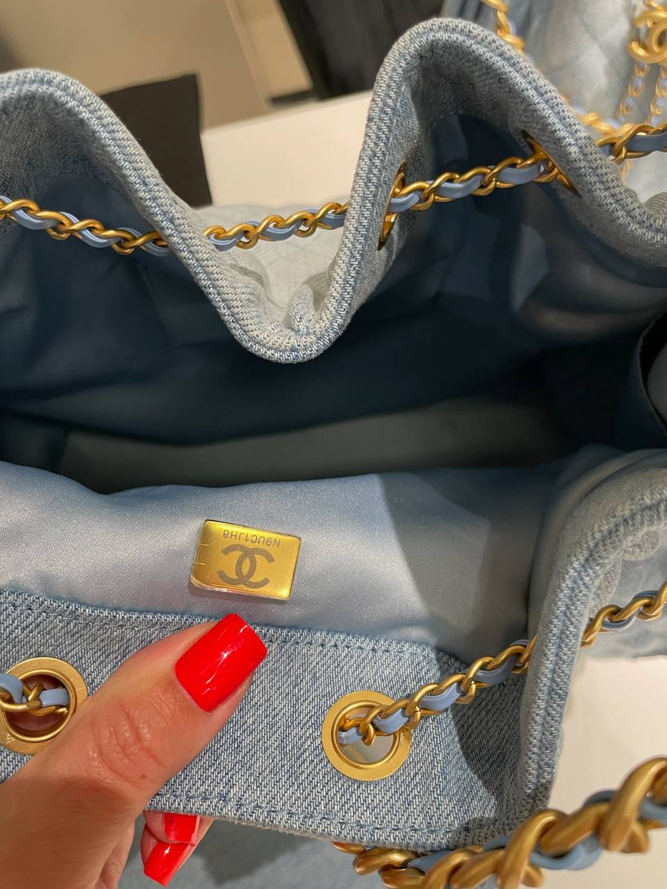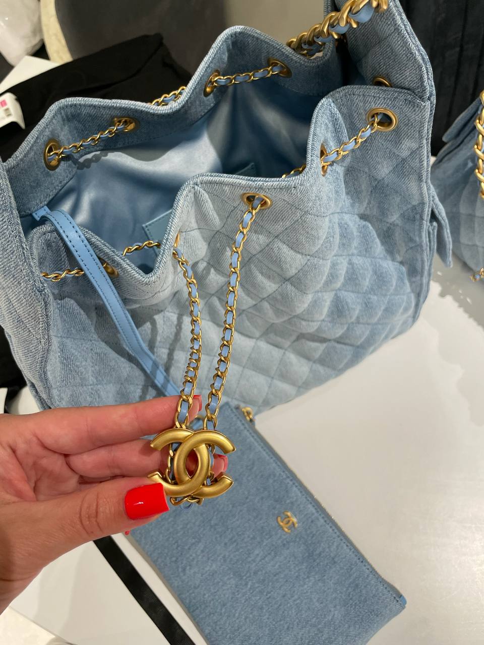 Сумка женская Chanel LUX-118587 - это стильный аксессуар для современной женщины. Сумка выполнена из денима в нежно-голубом цвете. Уникальный дизайн с ромбовидной простежкой и золотистой фурнитурой добавляет элегантности и привлекательности.