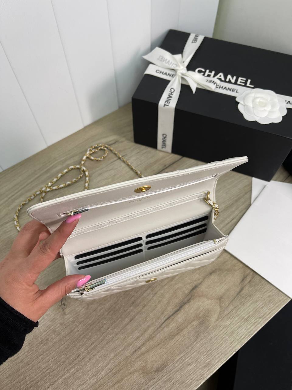 Сумка женская Chanel LUX-85656 представляет собой изысканный аксессуар, выполненный в классическом стиле. Она выполнена в белом цвете с характерной для бренда стеганой текстурой. Сумка имеет форму кошелька на цепочке, что делает ее идеальным выбором для вечерних выходов или повседневного использования.