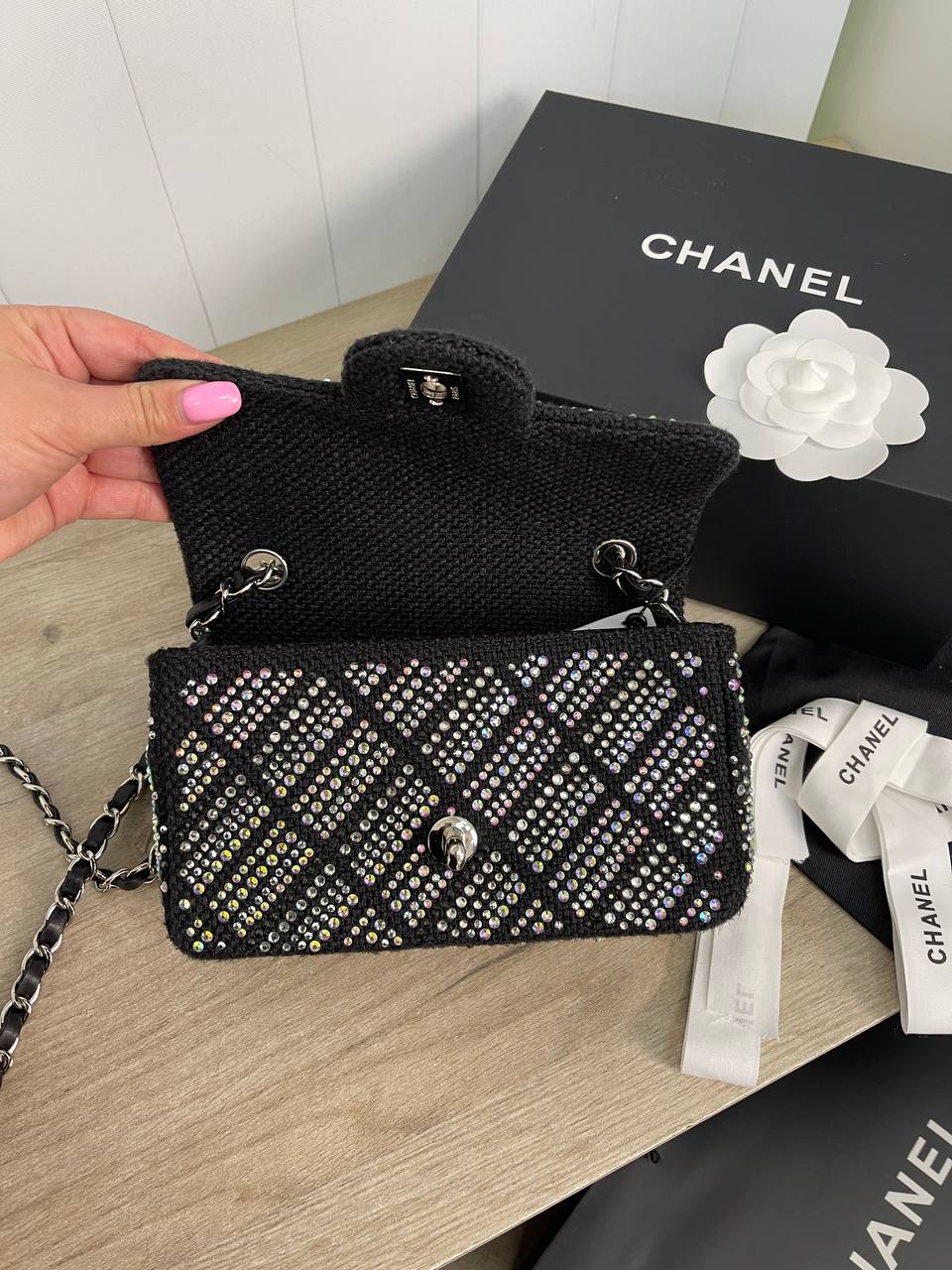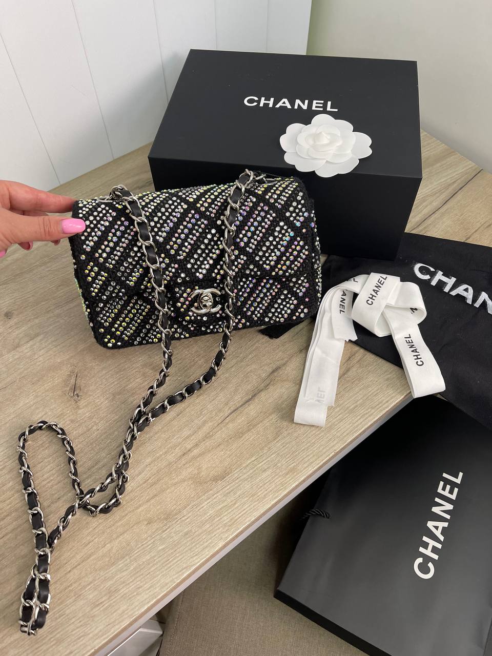 Сумка женская Chanel LUX-86289 - это изысканный аксессуар, сочетающий в себе роскошь и современный стиль. Черный цвет в сочетании с переливающимися стразами создает эффектный внешний вид. Такая сумка станет отличным дополнением к вечернему образу или же элегантным акцентом в повседневном стиле.