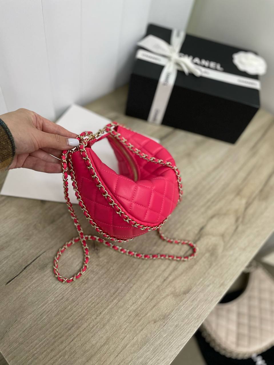 Сумка женская Chanel LUX-86917 — это яркий аксессуар от известного бренда. Розовая сумка выполнена в форме полумесяца с ромбовидной стежкой. Модель дополнена золотистой цепочкой, которую можно носить на плече.