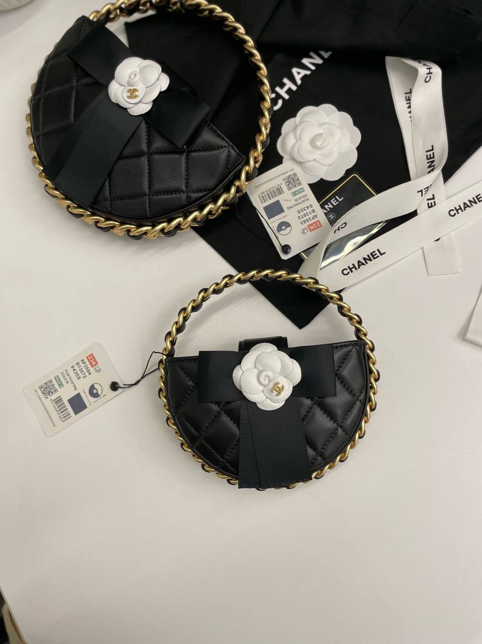 Сумка женская Chanel LUX-97132 представляет собой элегантный аксессуар, выполненный в классическом стиле. Она сочетает в себе черный цвет и текстуру стеганой кожи, дополненные золотистой цепочкой и контрастным бантом с цветком. Эта сумка идеально подходит для вечерних выходов и особых случаев.