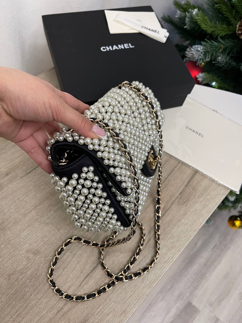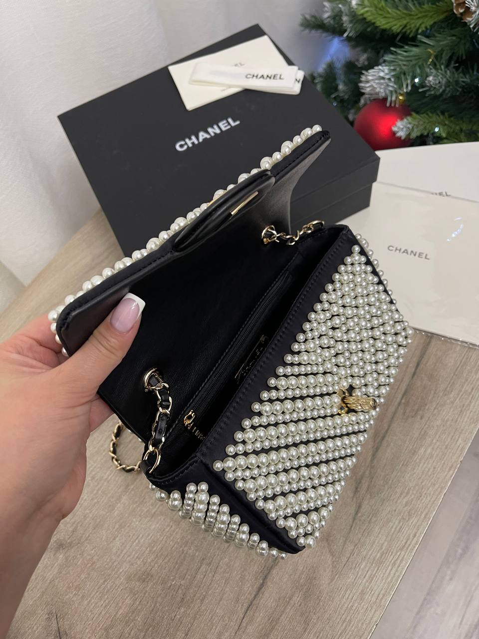 Сумка женская Chanel LUX-100194 – воплощение элегантности и роскоши. Эта черная сумка украшена множеством жемчужин, создавая изысканный и неповторимый стиль. Дополнена цепочкой для ношения на плече, она идеально подходит для вечерних выходов и особых случаев.