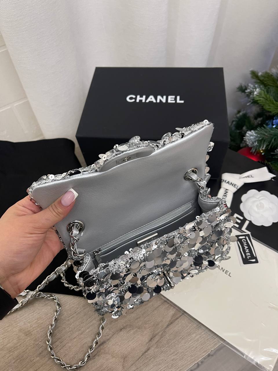Сумка женская Chanel LUX-100292 — это яркий аксессуар, который подчеркнет индивидуальность и стиль. Сумка выполнена в серебристом цвете с крупными пайетками, что придает ей праздничный и нарядный вид. Классический дизайн делает ее подходящей для вечерних выходов и особых случаев.