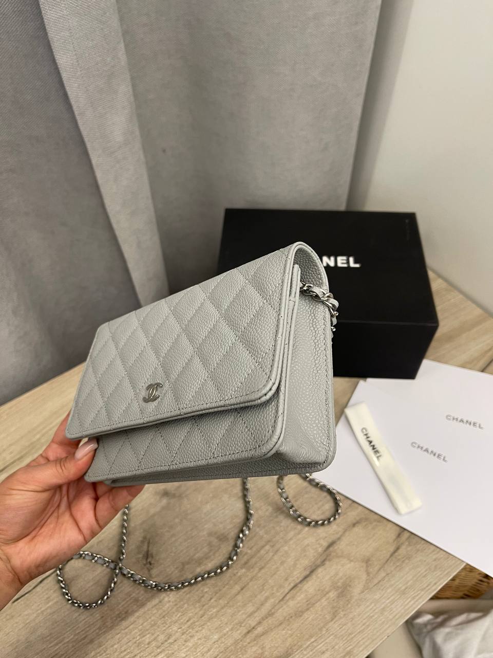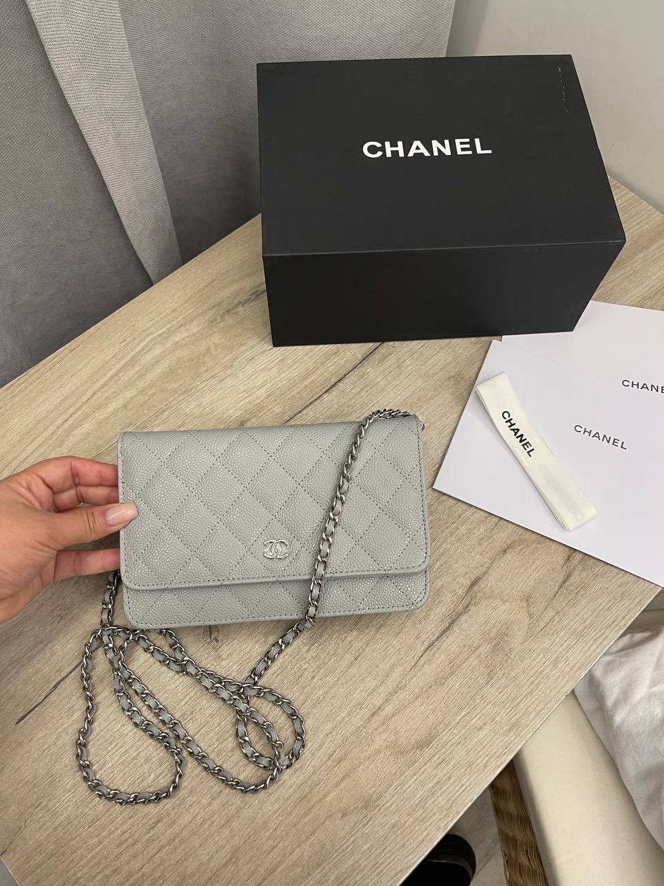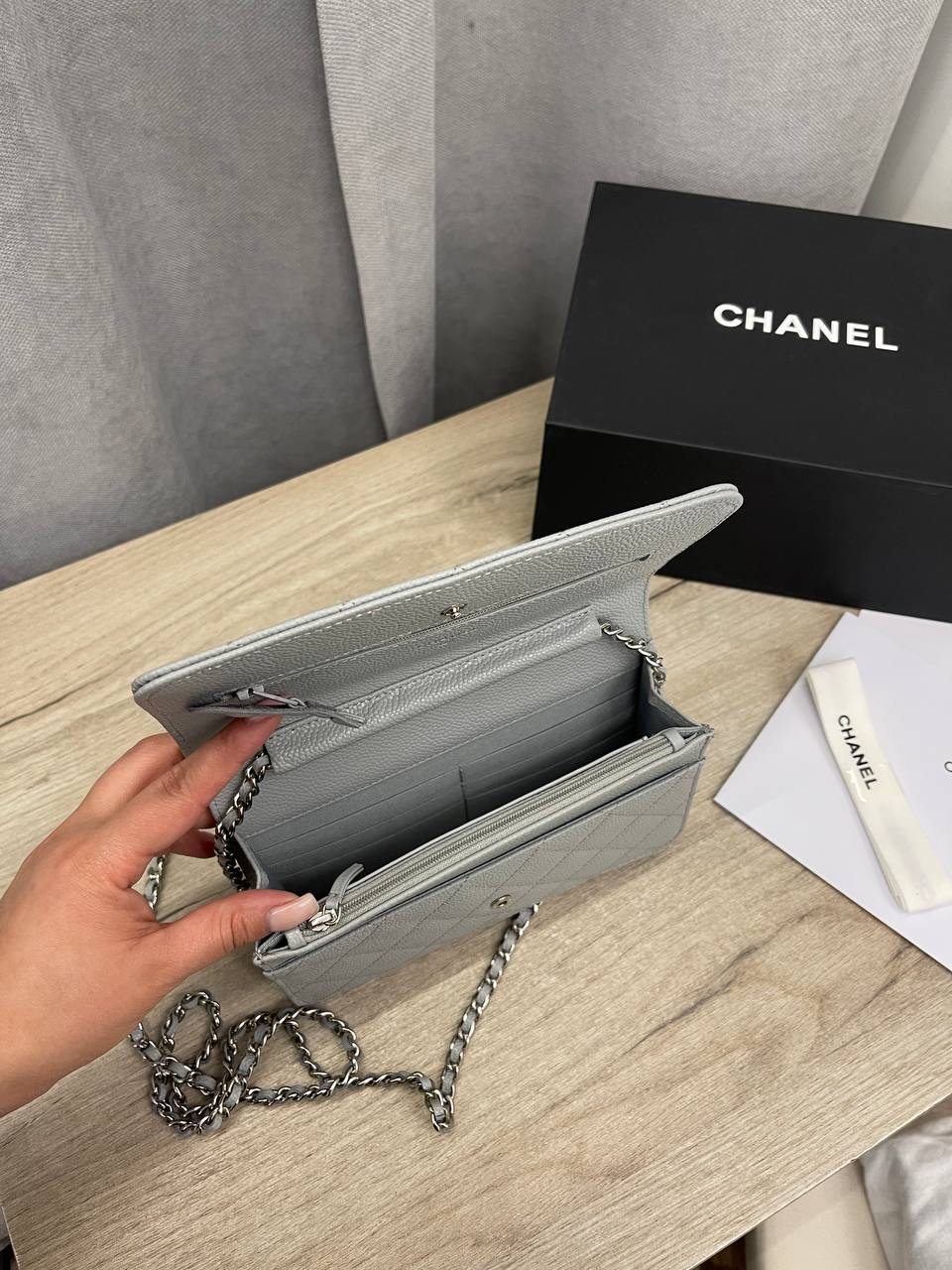 Сумка женская Chanel LUX-104202 представляет собой элегантный аксессуар, выполненный в классическом стиле. Сумка выполнена в светло-сером цвете с текстурой, украшенной фирменным стеганым узором. Она оснащена серебристой цепочкой, а также имеет лаконичный дизайн, который делает её универсальным аксессуаром.