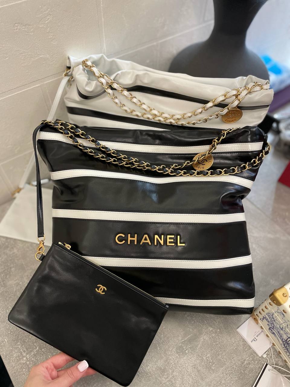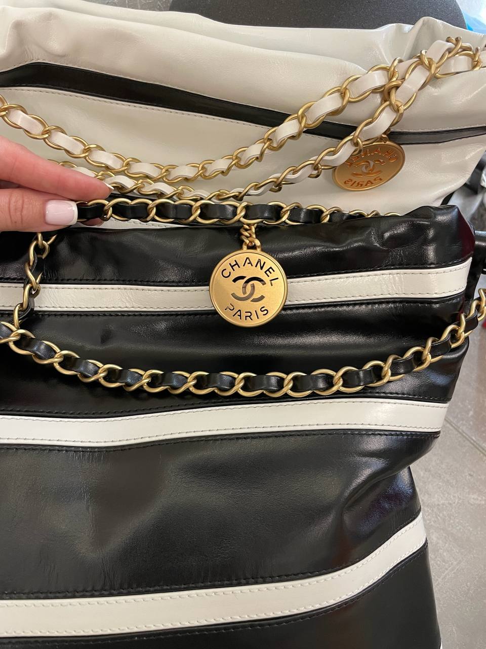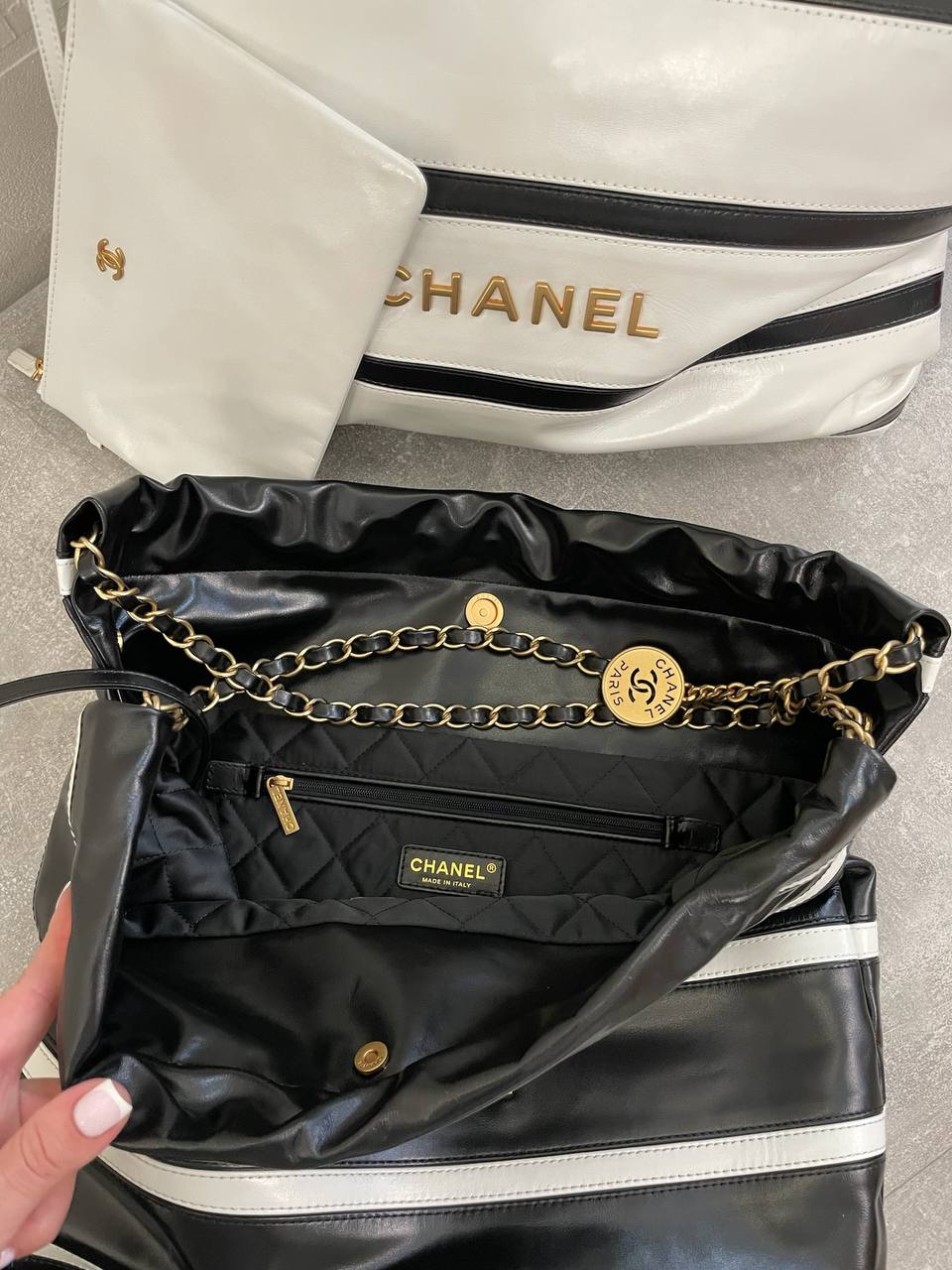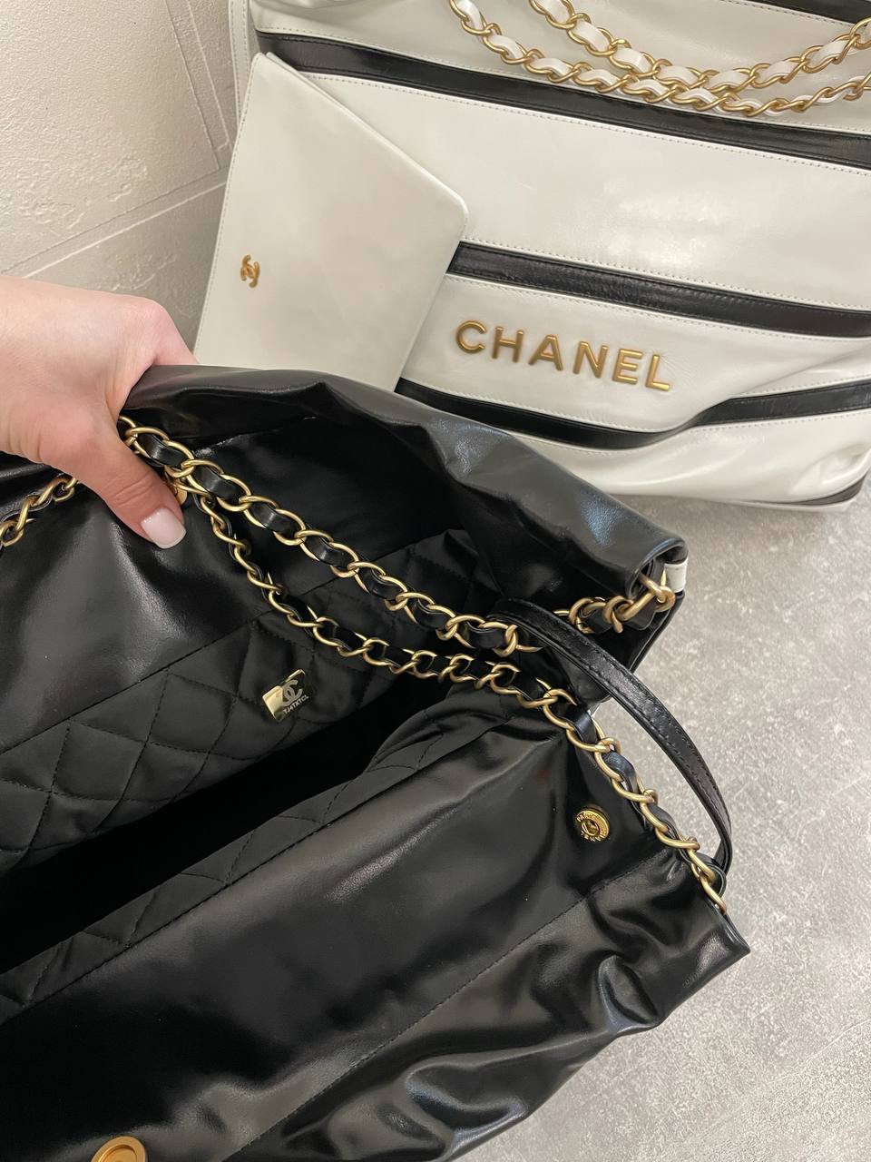 Сумка женская Chanel LUX-105226 — это стильная сумка, сочетающая в себе элегантность и практичность. Черный цвет сумки с белыми полосками, подчеркивает ее современный дизайн, а форма делает ее идеальным аксессуаром для повседневного использования.