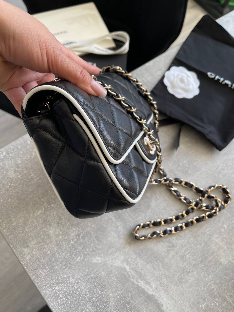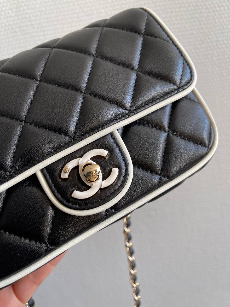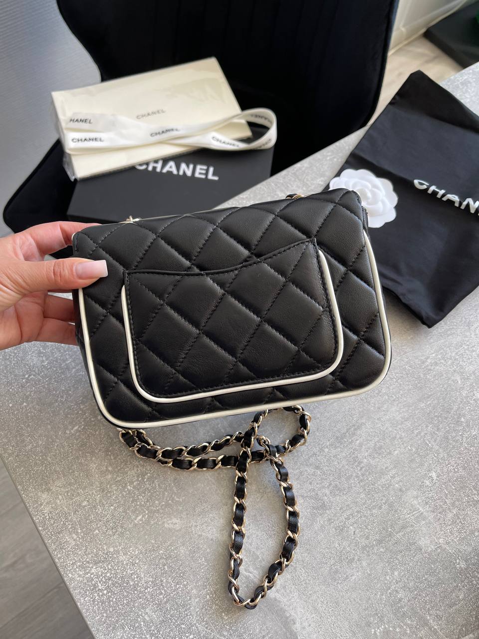 Сумка женская Chanel LUX-116981 выполнена в классическом стиле. Черная стеганая сумка прямоугольной формы с белой окантовкой, дополнена цепочкой-ручкой золотистого цвета. Идеально подойдет для повседневной носки и особых случаев.