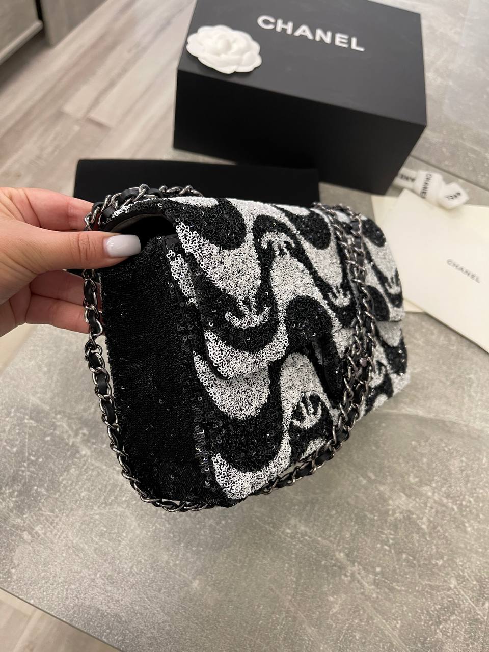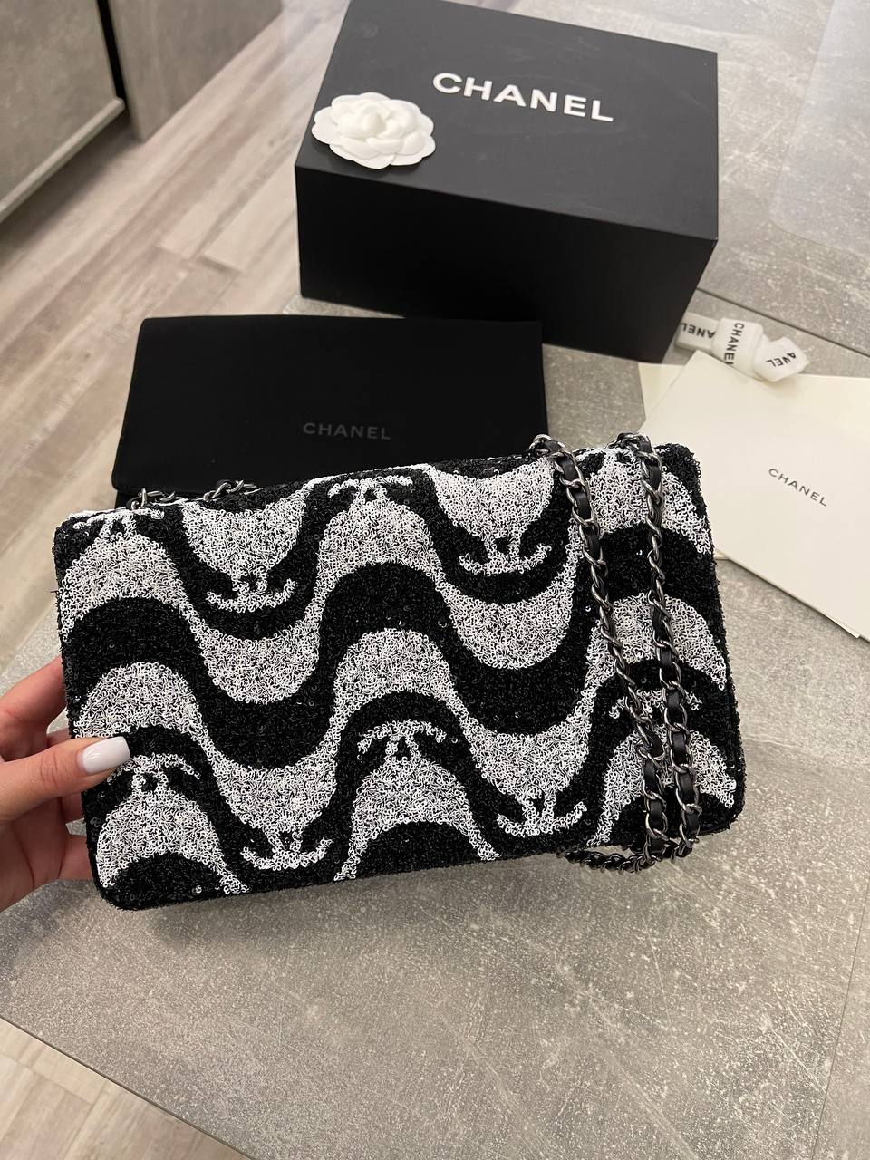 Сумка женская Chanel LUX-106793 – это элегантный аксессуар от известного бренда Chanel, выполненный в оригинальном стиле. Сумка сочетает в себе черный и белый цвета с необычным узором, а также классическую форму. Этот аксессуар станет отличным дополнением к любому образу.