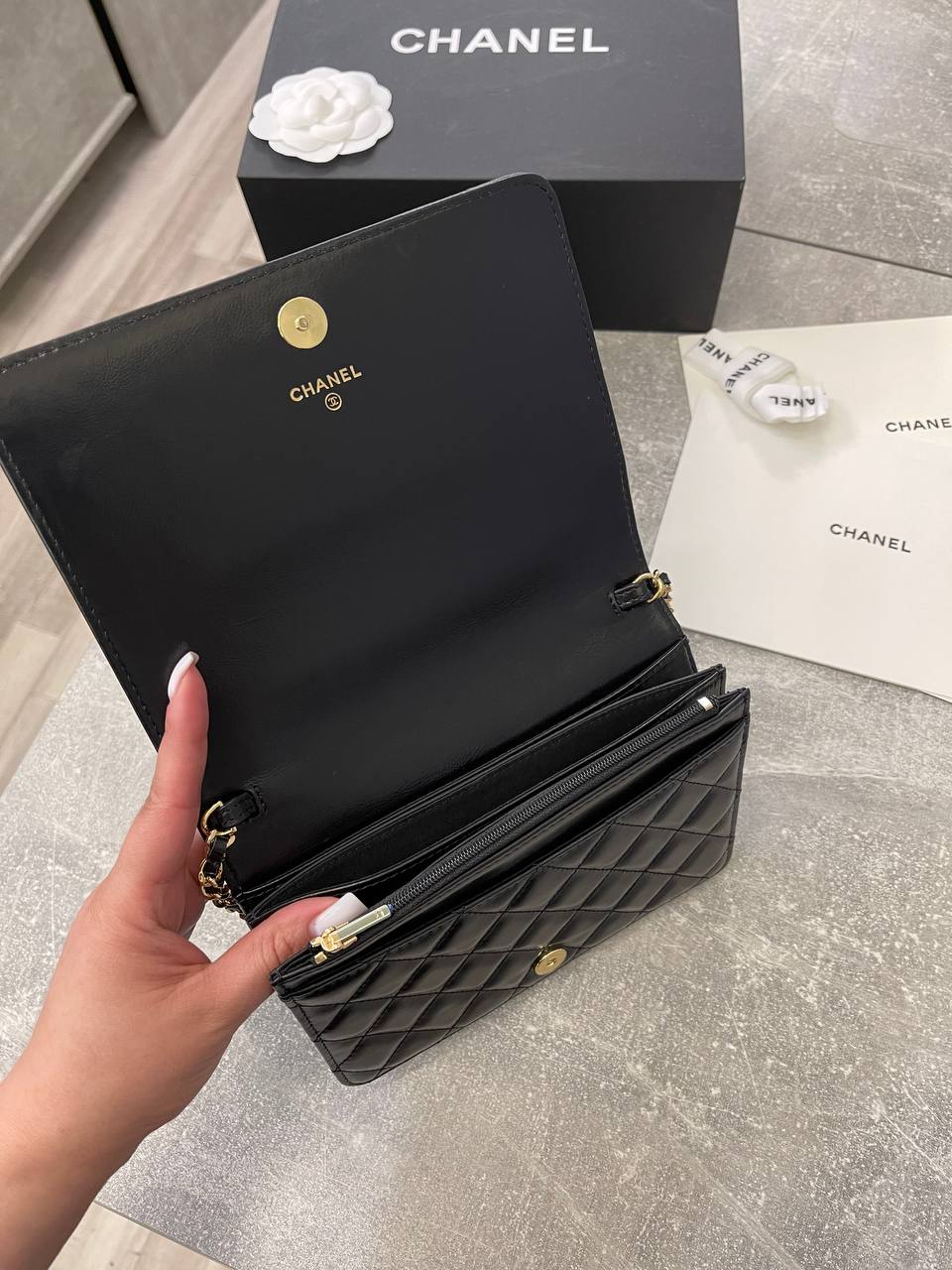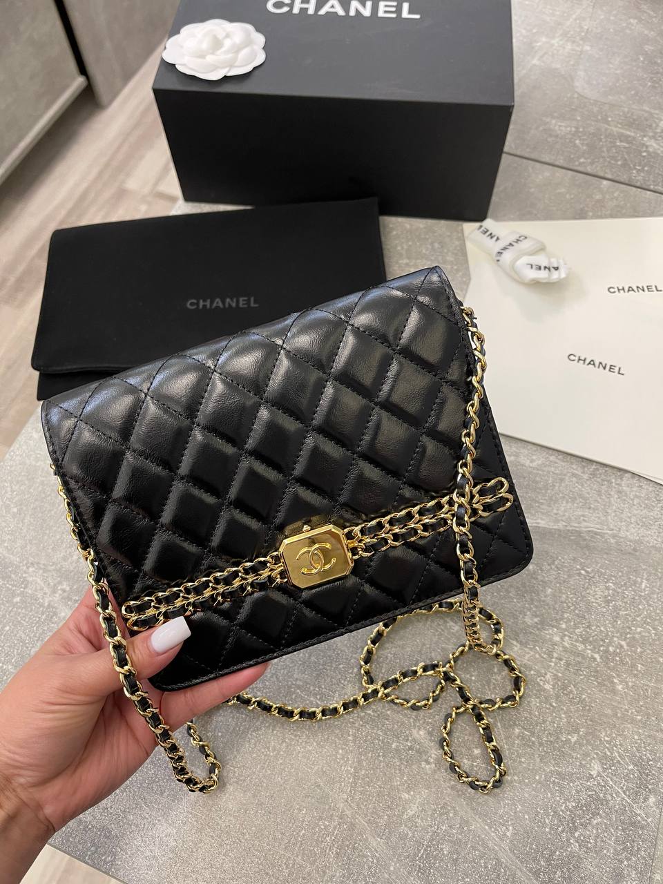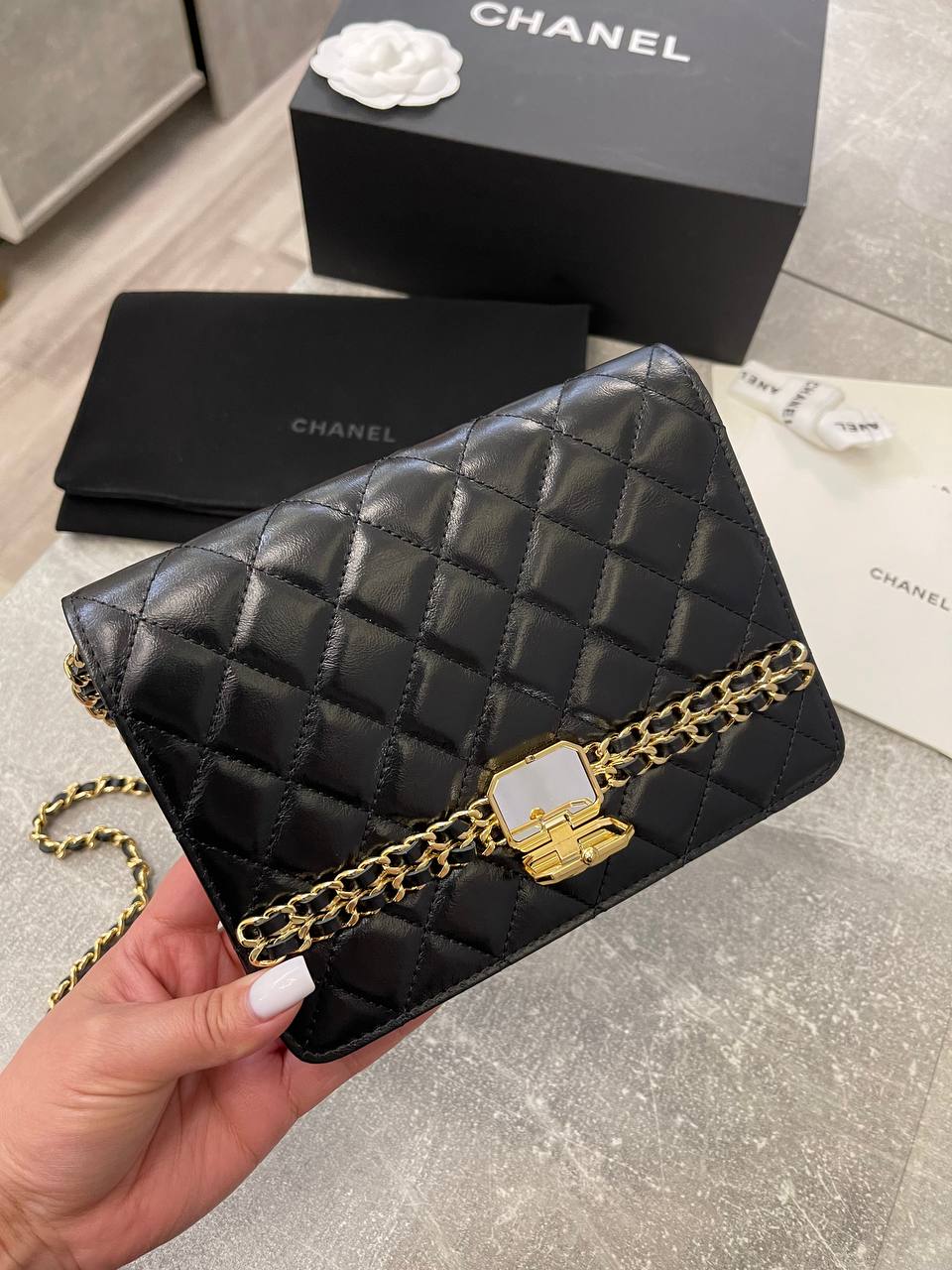 Судя по изображению, перед нами женская сумка Chanel LUX-106801. Классический дизайн сумки выполнен в черном цвете с золотистой фурнитурой. Сумка имеет стеганую текстуру, длинную цепочку и небольшую золотую застежку с логотипом бренда.