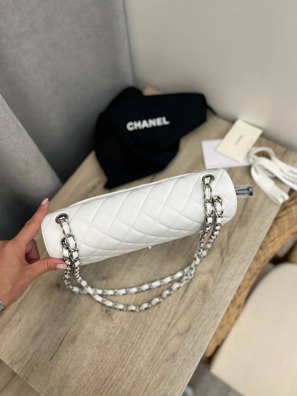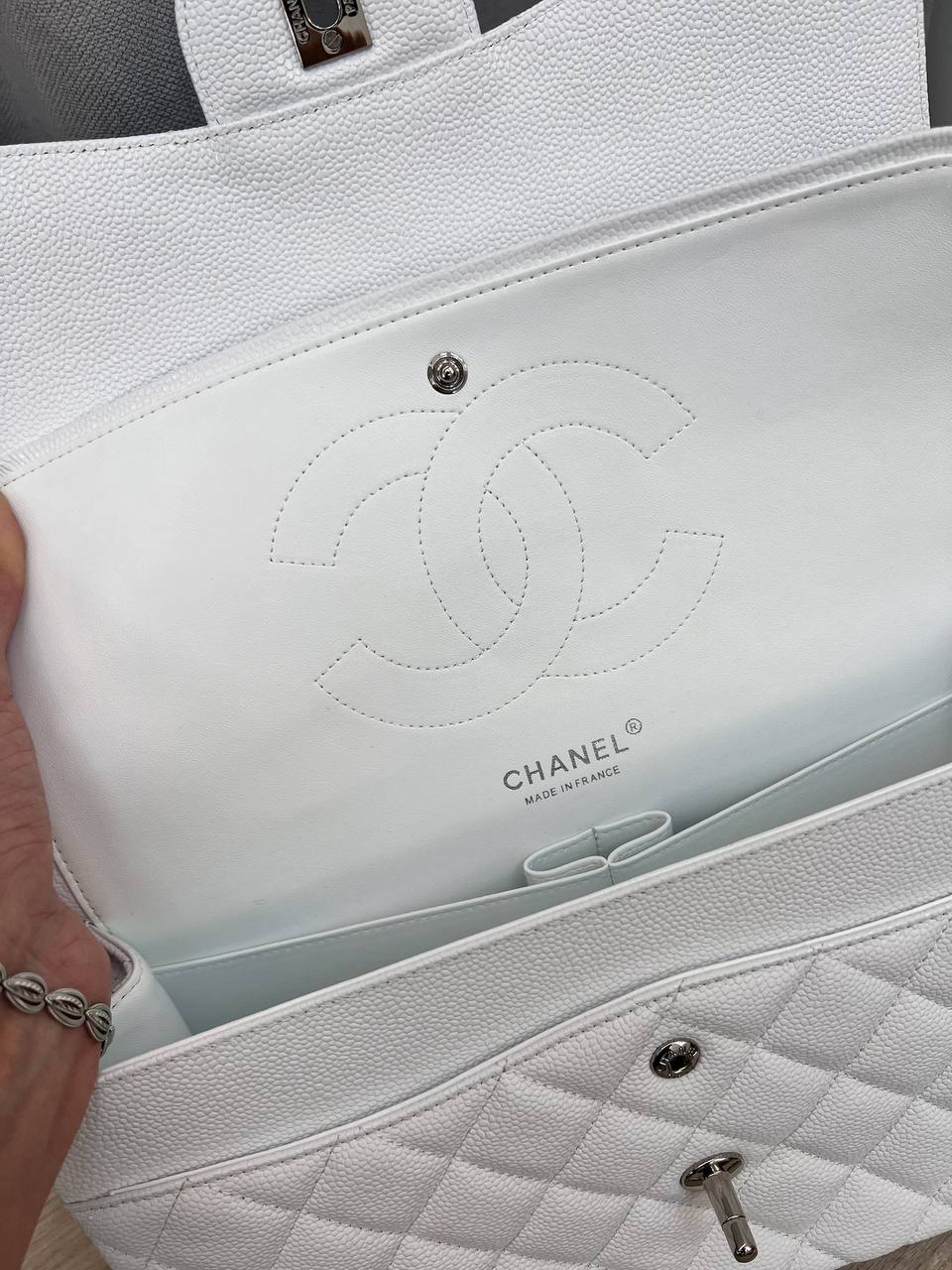 Сумка женская Chanel LUX-108762 выполнена в классическом стиле, отличается белым цветом и стеганым узором. Эта элегантная сумка предназначена для повседневного использования, а также для особых случаев, добавляя изысканности любому образу.