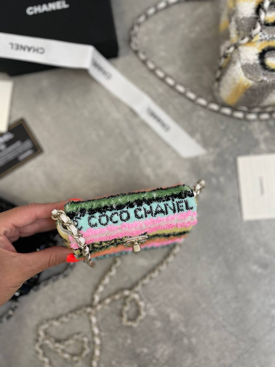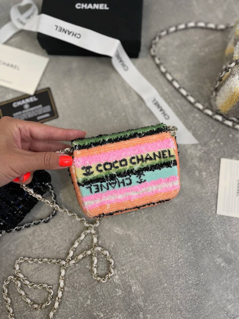 Женская сумка Chanel LUX-108782 представляет собой модный аксессуар, выполненный в ярком и оригинальном дизайне. Сумка выполнена в разноцветных оттенках с пайетками, что делает ее отличным вариантом для создания стильных образов. Предназначена для ношения на плече или через плечо.
