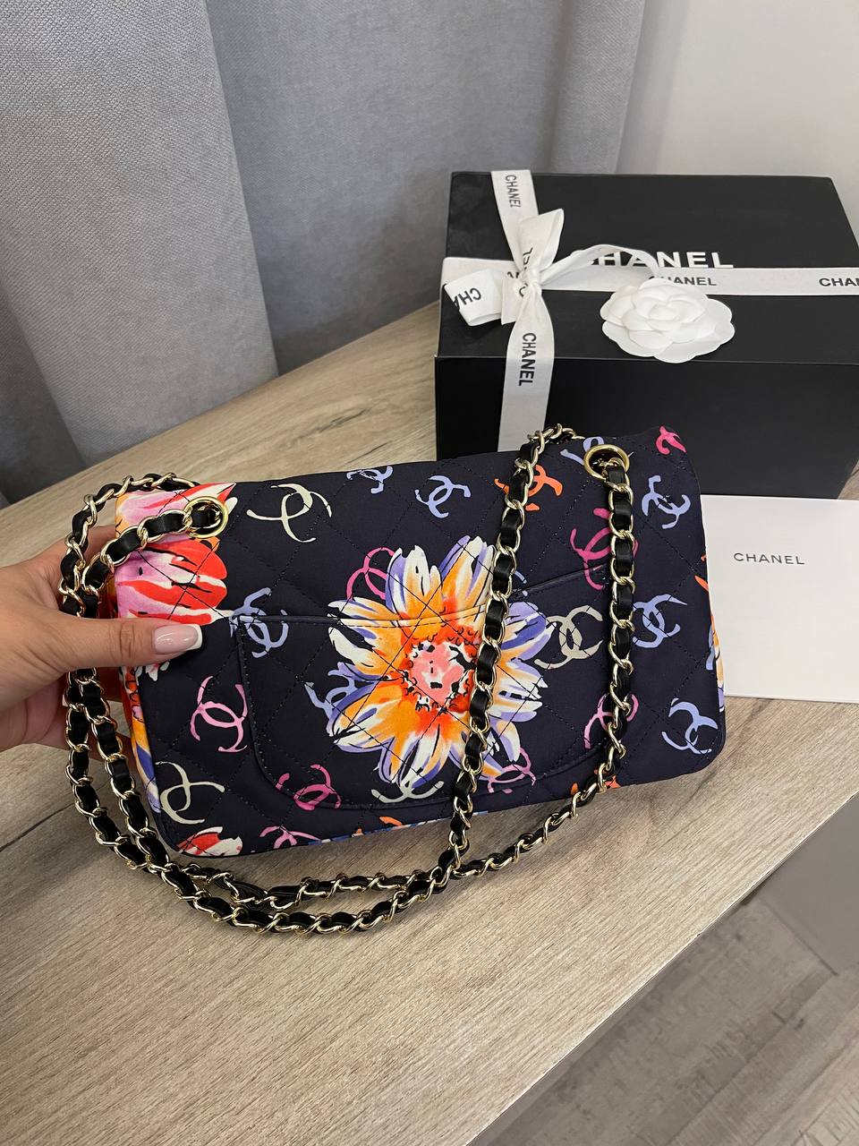 Сумка женская Chanel LUX-109690 представляет собой стильный аксессуар, который сочетает в себе элегантность и оригинальность. Сумка выполнена в насыщенном цветочном принте на темно-синем фоне, украшена декоративными элементами и золотистой фурнитурой. Идеально подходит для создания ярких и запоминающихся образов.