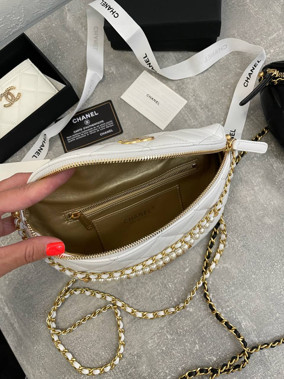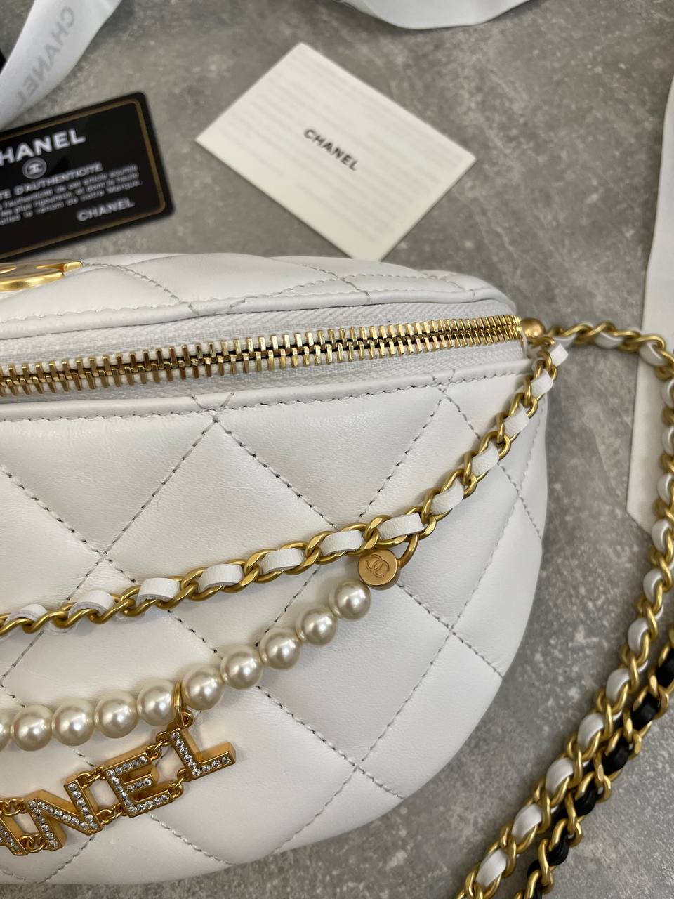 Сумка женская Chanel LUX-108808 выполнена в белом цвете, имеет стеганую текстуру и элегантный дизайн. Сумка имеет форму полумесяца, украшена логотипом бренда и декоративной цепочкой с жемчугом, придающей ей особый шарм. Она идеально подходит для повседневного использования и может стать стильным дополнением к любому образу.