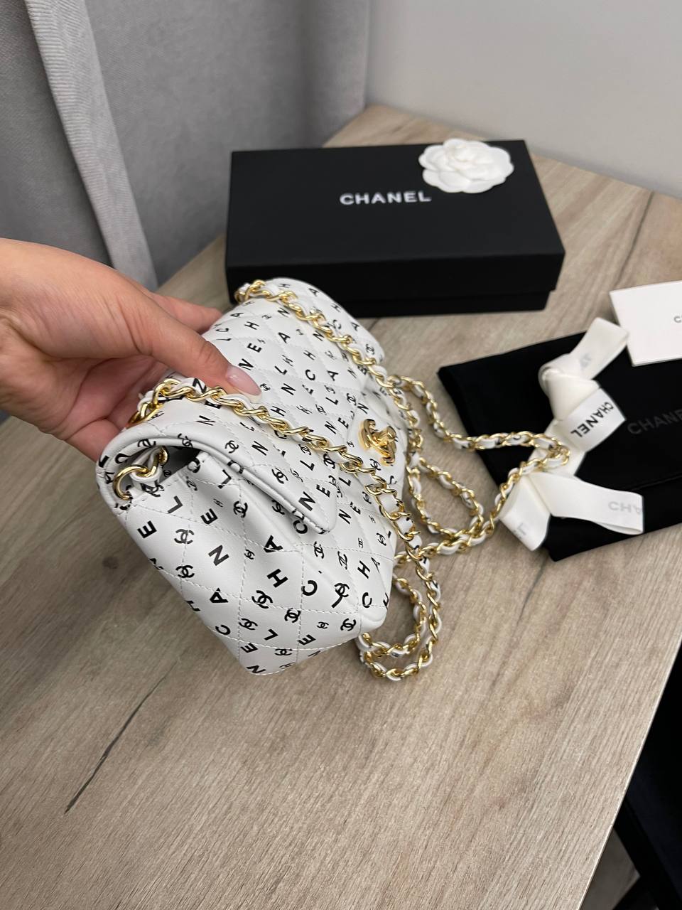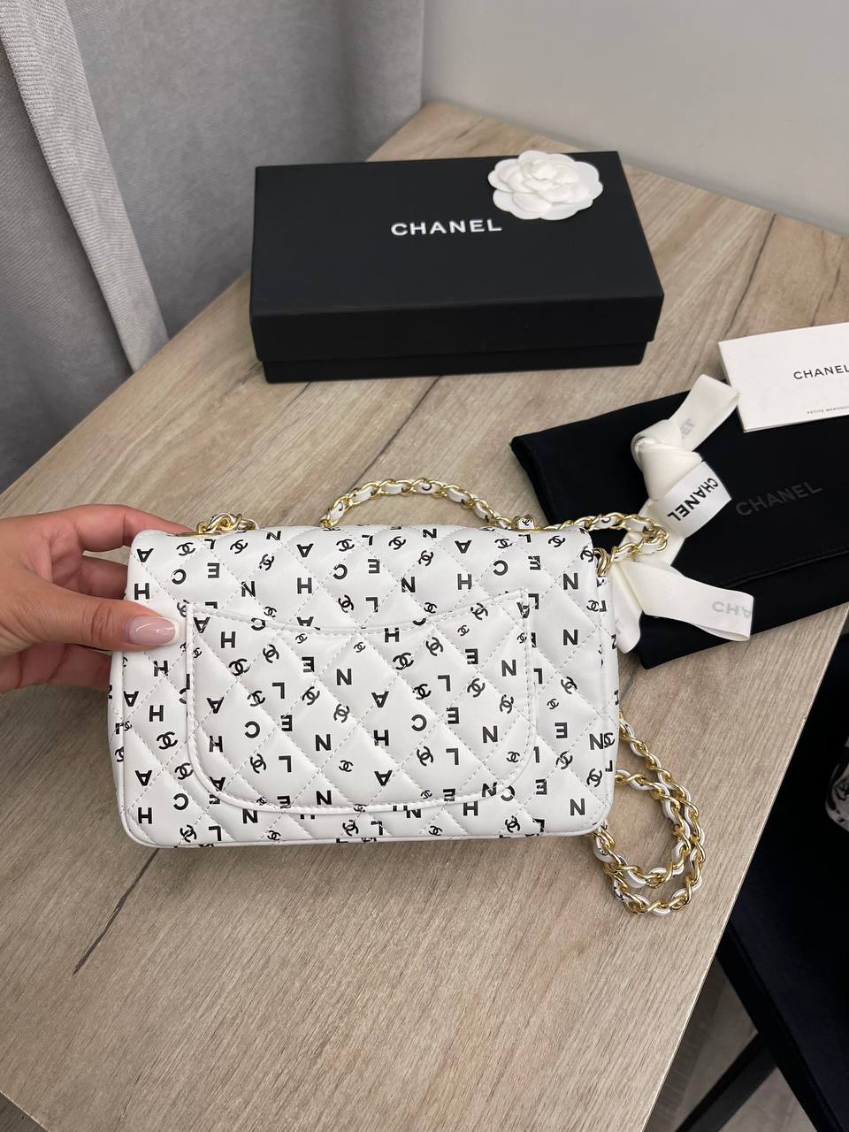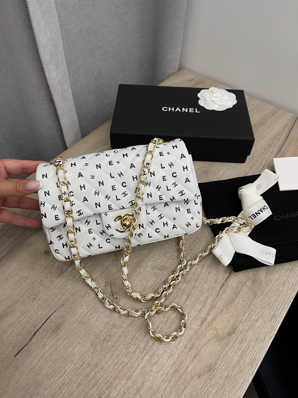 Сумка женская Chanel LUX-109889 - это изысканный аксессуар, который сочетает в себе стиль и функциональность. Белый цвет и узор из повторяющихся логотипов, делают сумку выразительной и узнаваемой. Сумка идеально подходит для создания элегантных и модных образов.