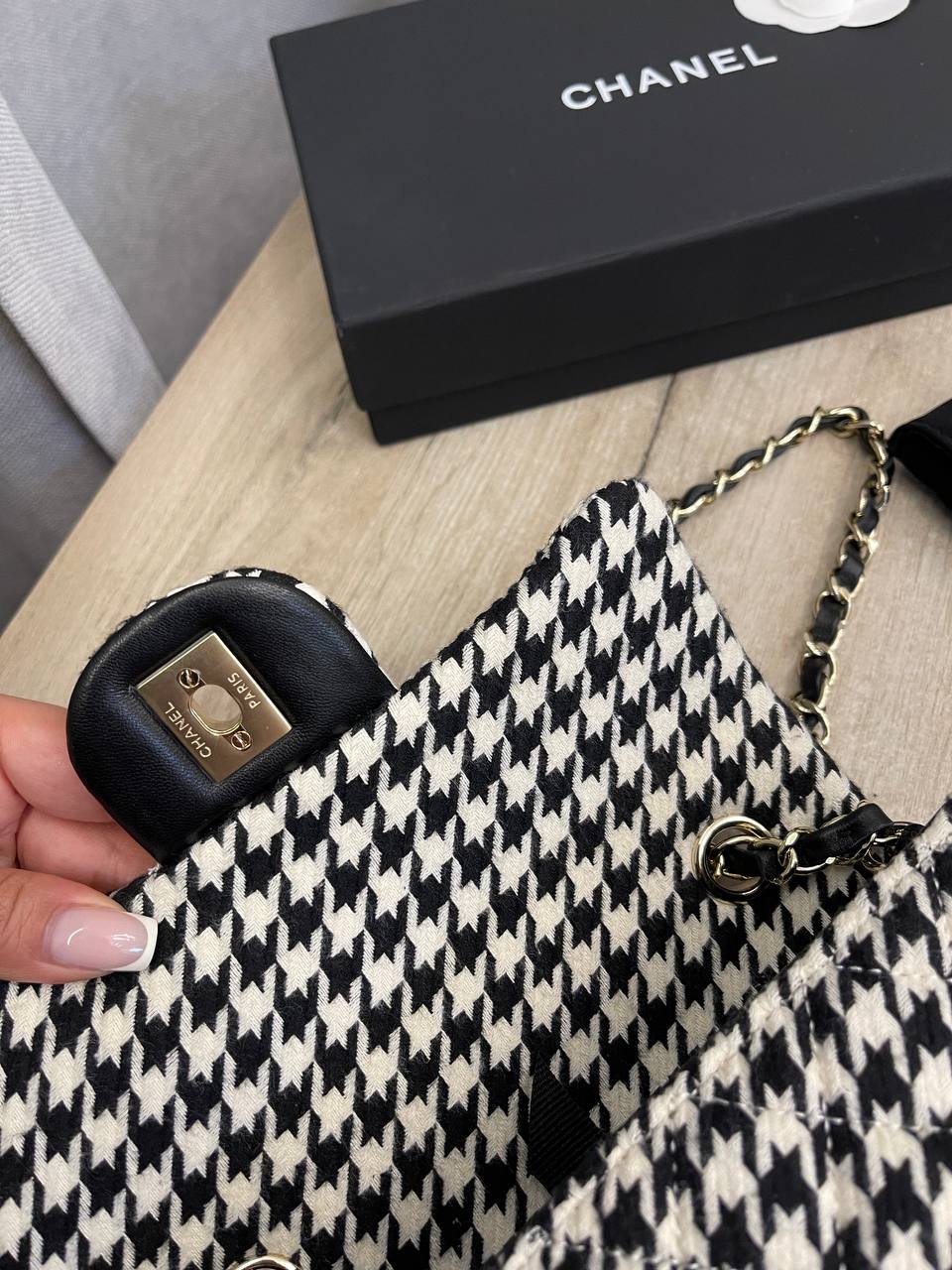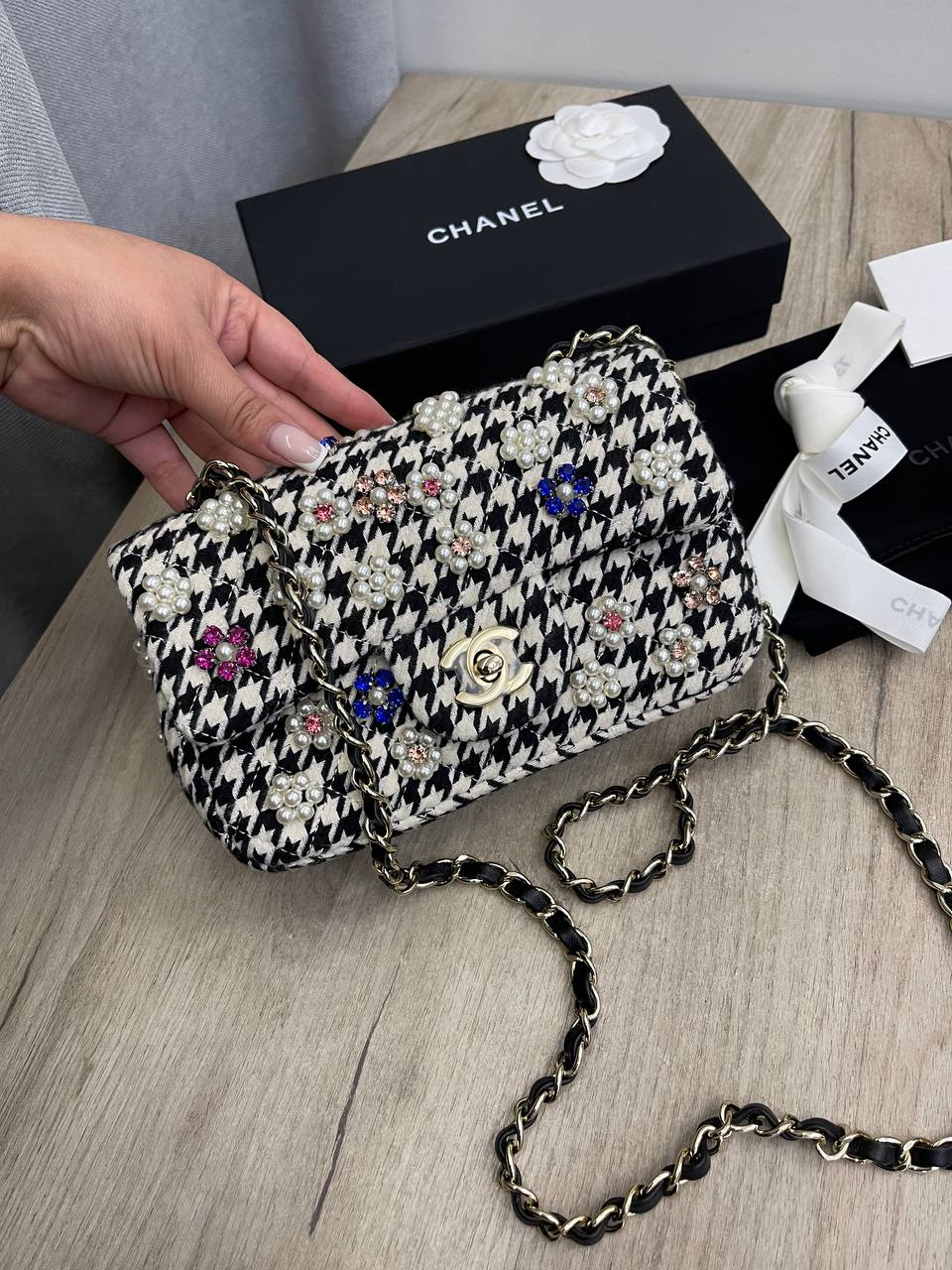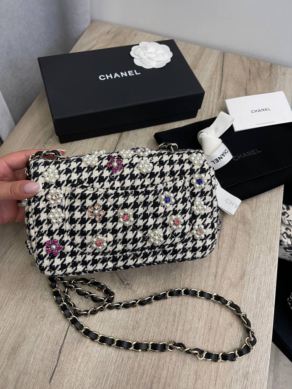 Сумка женская Chanel LUX-109892 выполнена в классическом стиле с элементами роскоши. Основной цвет - черно-белый, узор - "гусиная лапка". Сумка украшена декором в виде цветов и страз. Предназначена для создания элегантных образов.