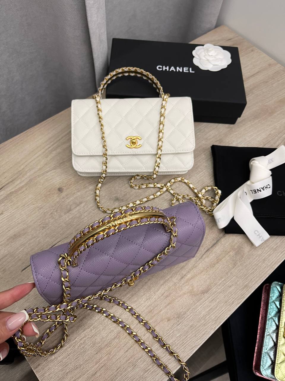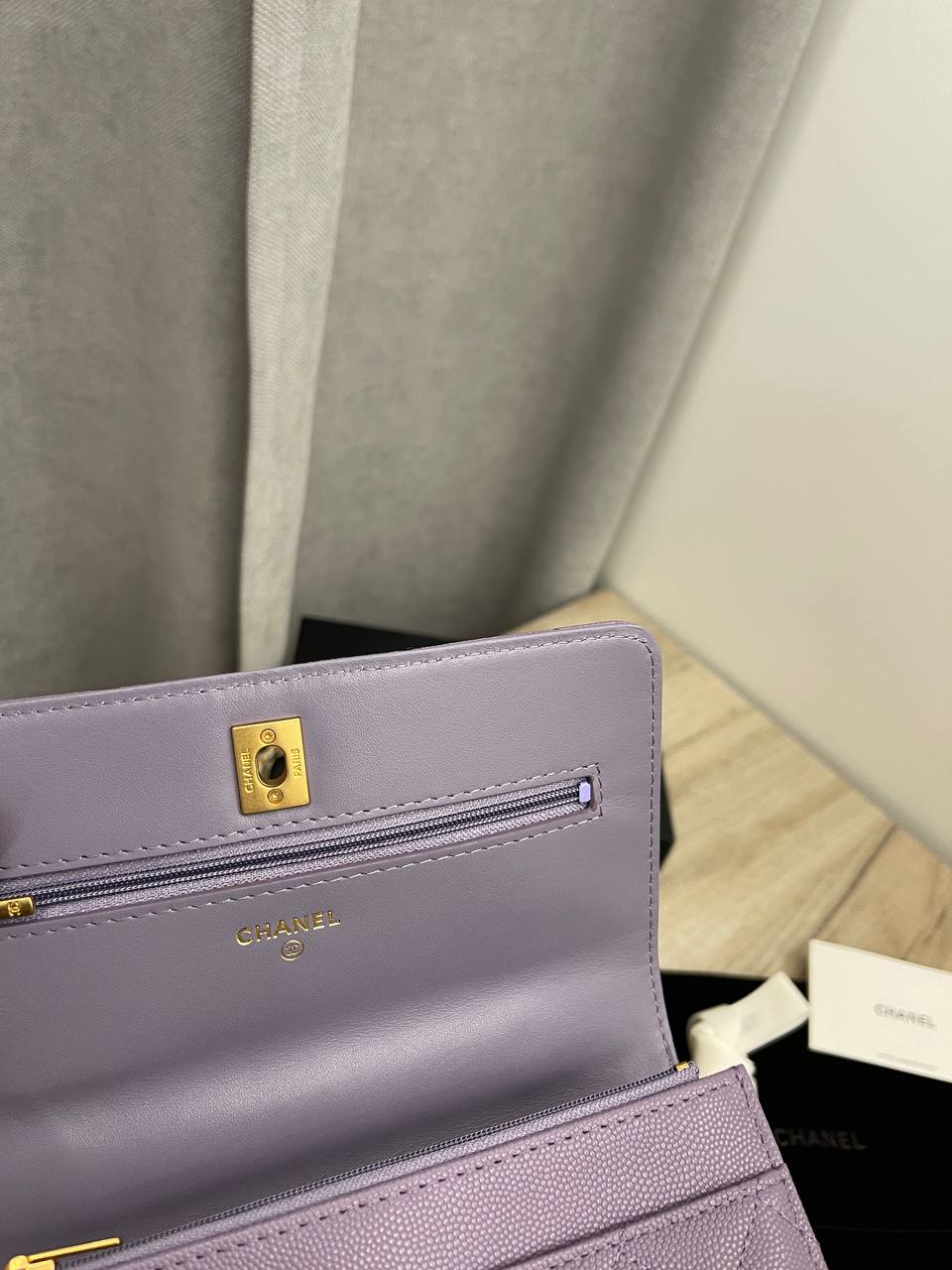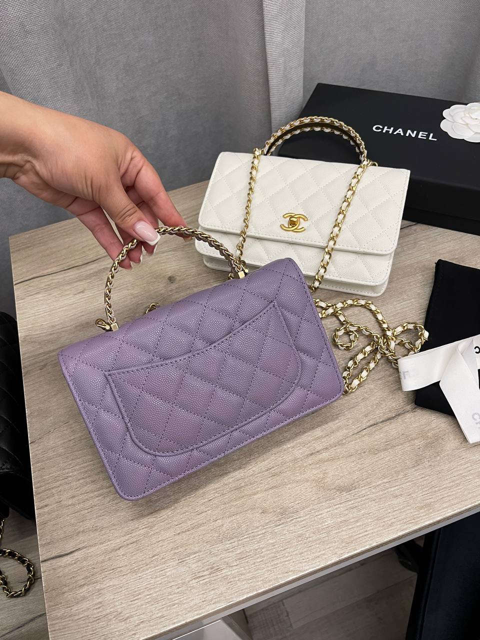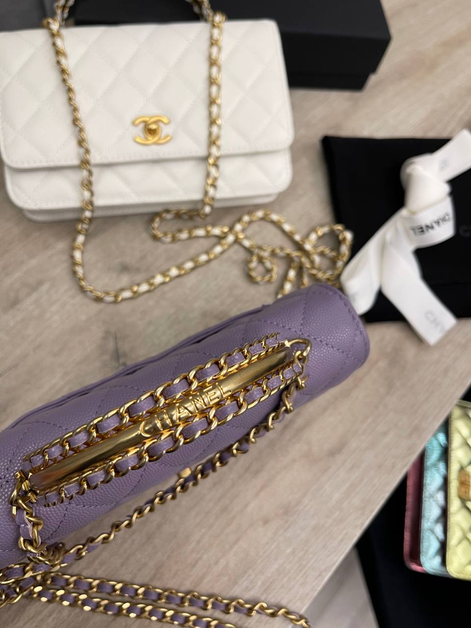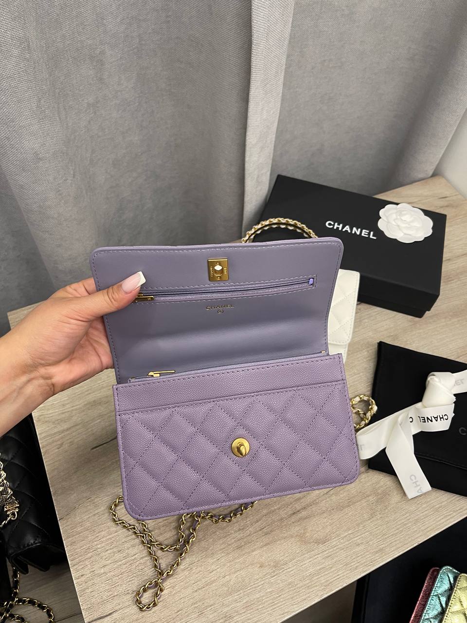 Сумка женская Chanel LUX-109904 — это элегантная сумка-клатч лилового цвета от известного бренда. Сумка выполнена в стеганом дизайне с золотой фурнитурой и цепочкой через плечо, что придает ей изысканный вид. Идеально подходит для вечерних выходов и особых случаев.