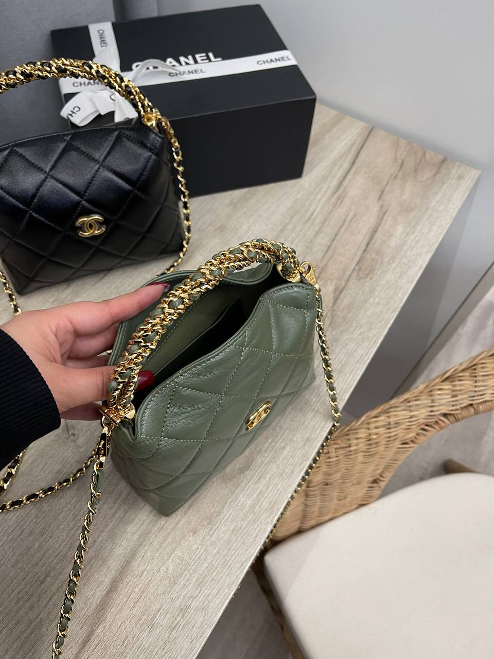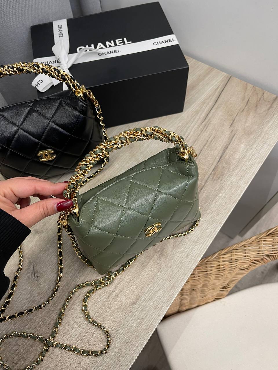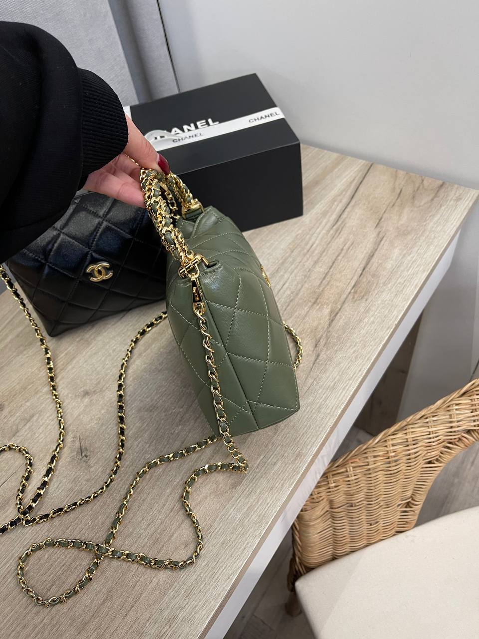 Сумка женская Chanel LUX-115494 – это стильный аксессуар от известного бренда. Сумка выполнена в темно-зеленом цвете, имеет стеганую текстуру и золотистые цепочки. Этот аксессуар идеально подойдет для завершения любого образа.