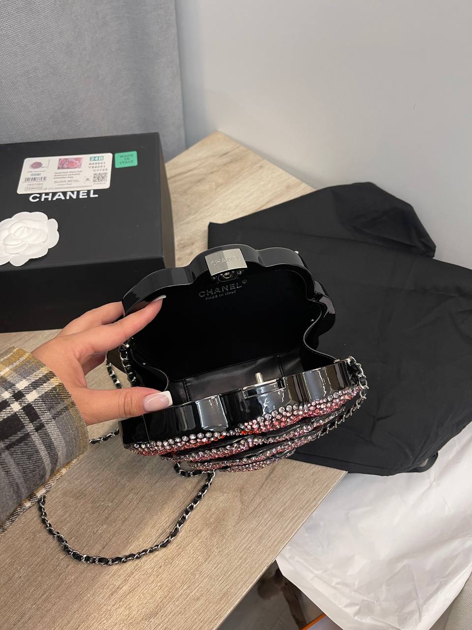 Сумка женская Chanel LUX-111818 представляет собой стильный аксессуар от известного бренда. Сумка выполнена в форме цветка розы, украшенного сверкающими элементами. Эта сумка станет ярким акцентом в вашем образе.