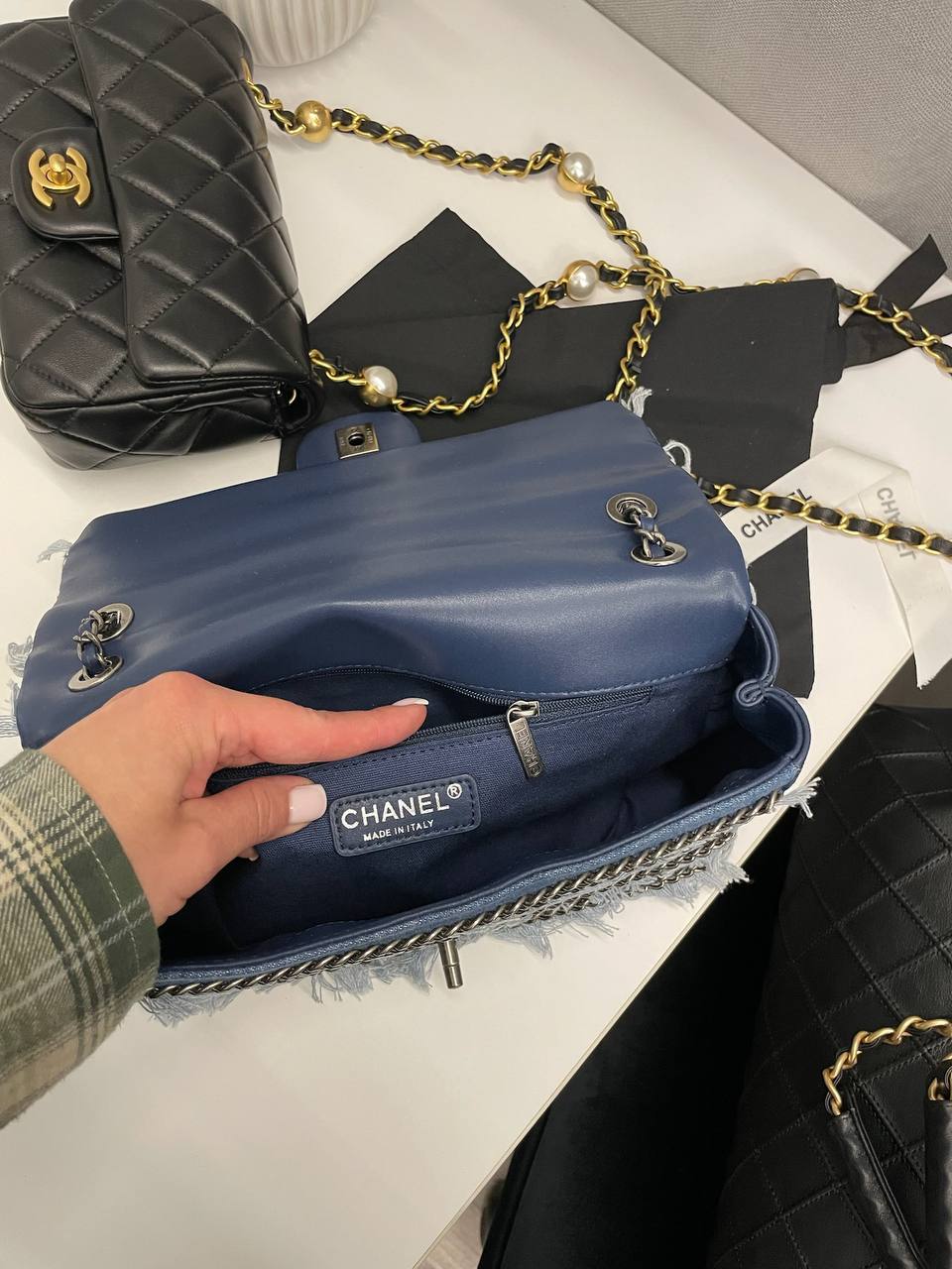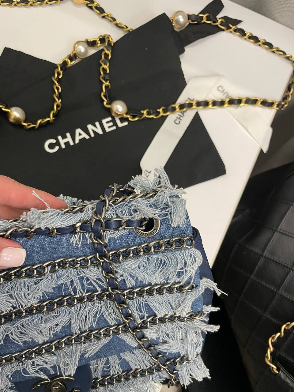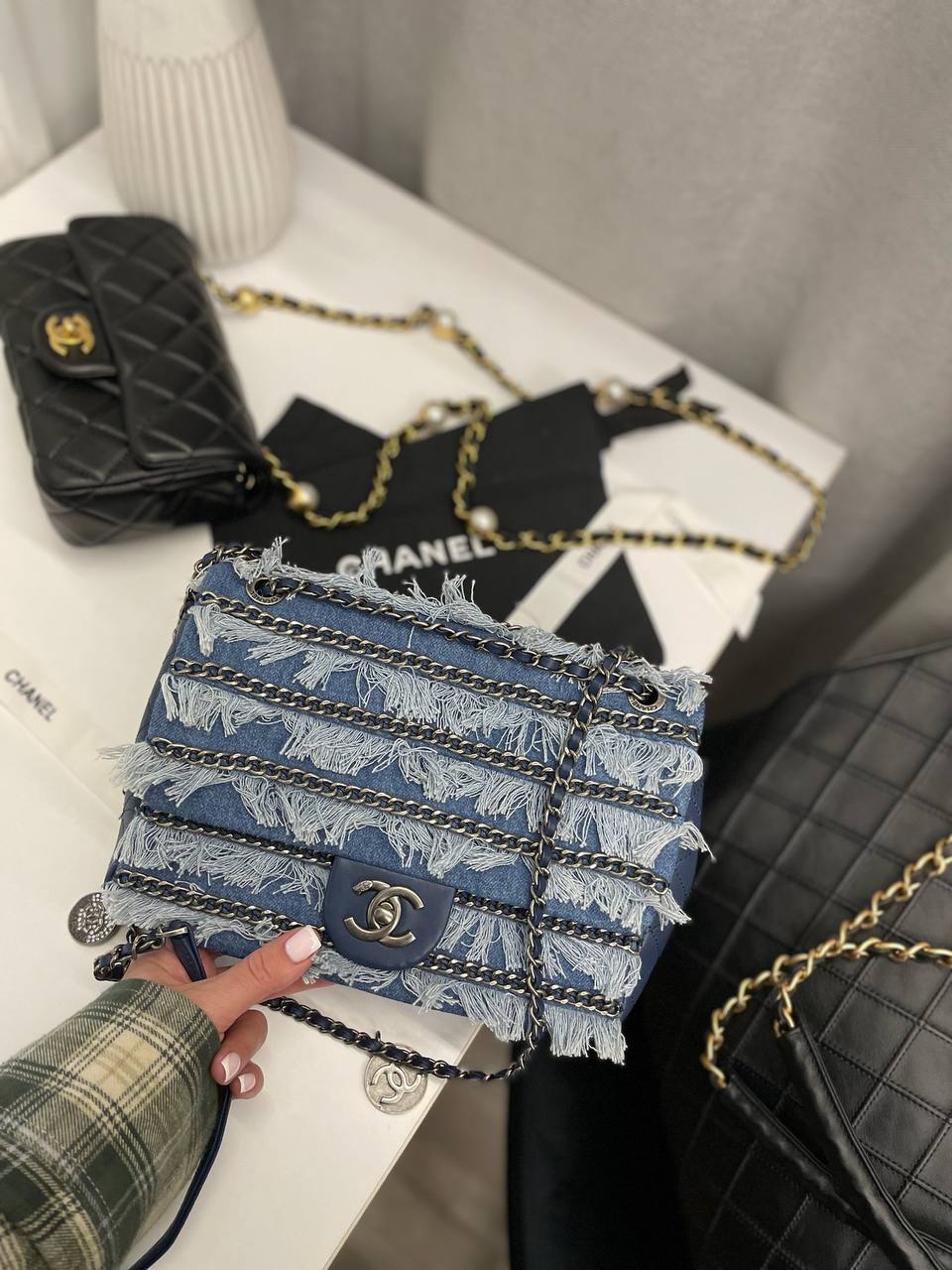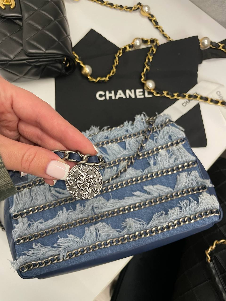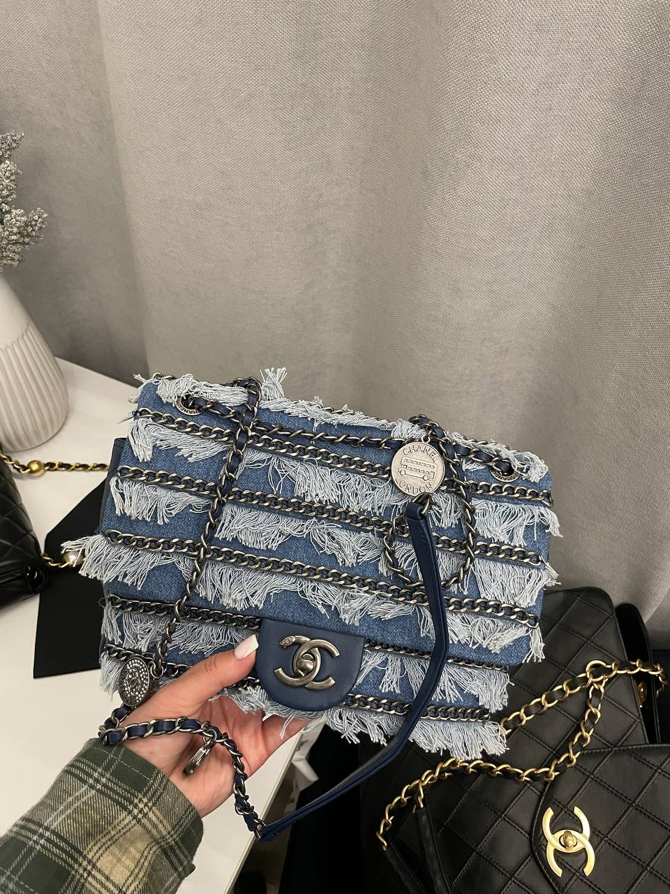 Сумка женская Chanel LUX-112979 выполнена в стильном дизайне с использованием денима. Сумка выполнена в синем цвете и украшена бахромой и цепочками. Идеально подойдет для создания стильного образа на каждый день.