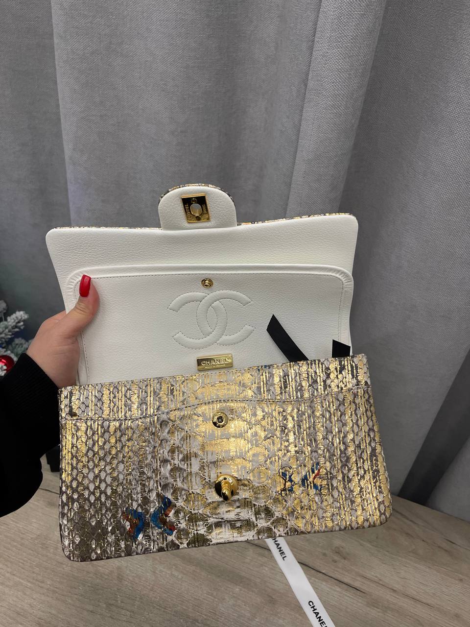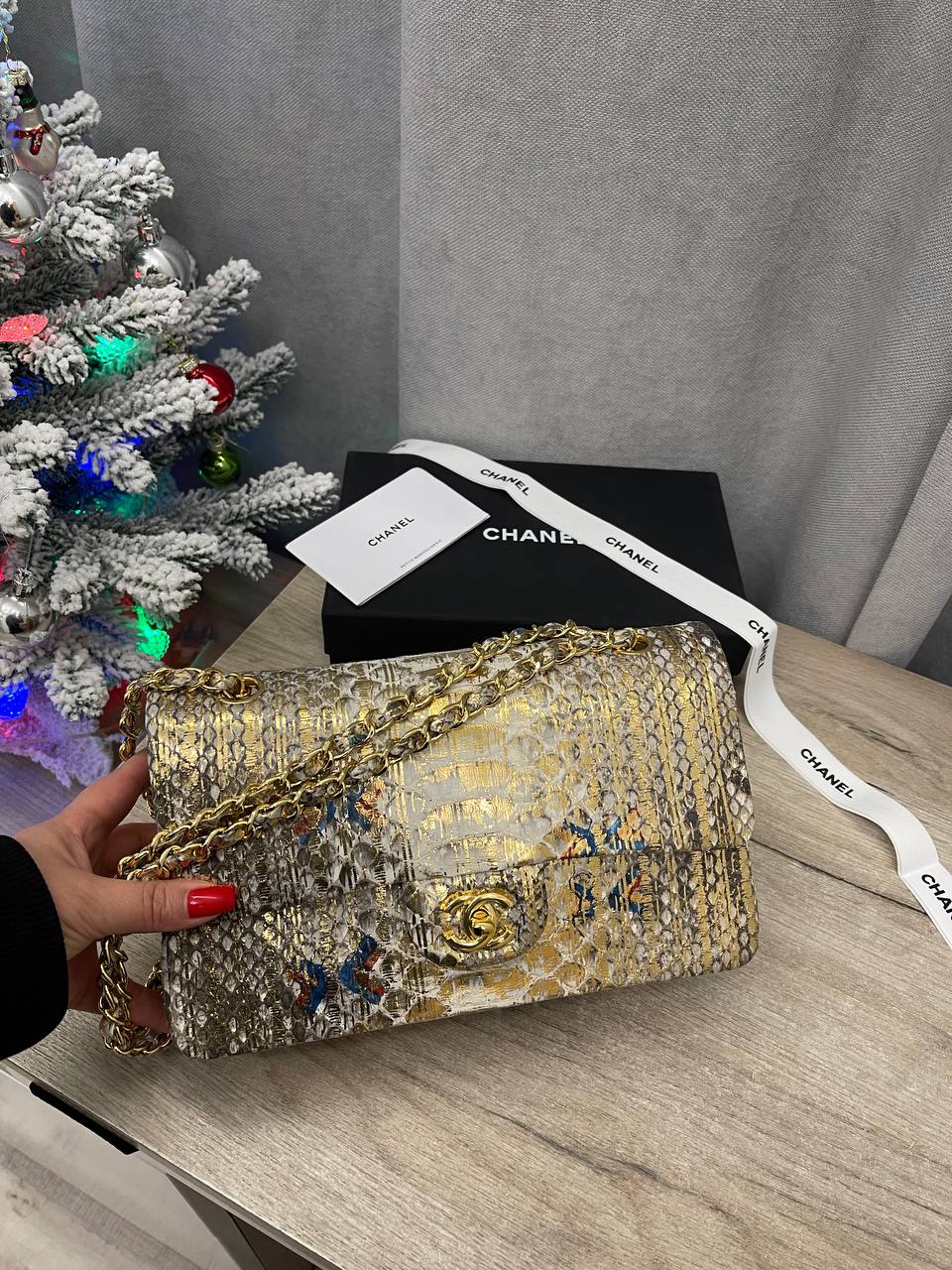 Сумка женская Chanel LUX-113591 — это элегантный аксессуар, выполненный в стиле Chanel. Золотистый цвет сумки с текстурой змеиной кожи придает ей роскошный вид, а золотая цепочка через плечо добавляет изысканности. Эта сумка идеально подойдет для особых случаев, подчеркивая индивидуальность своей обладательницы.