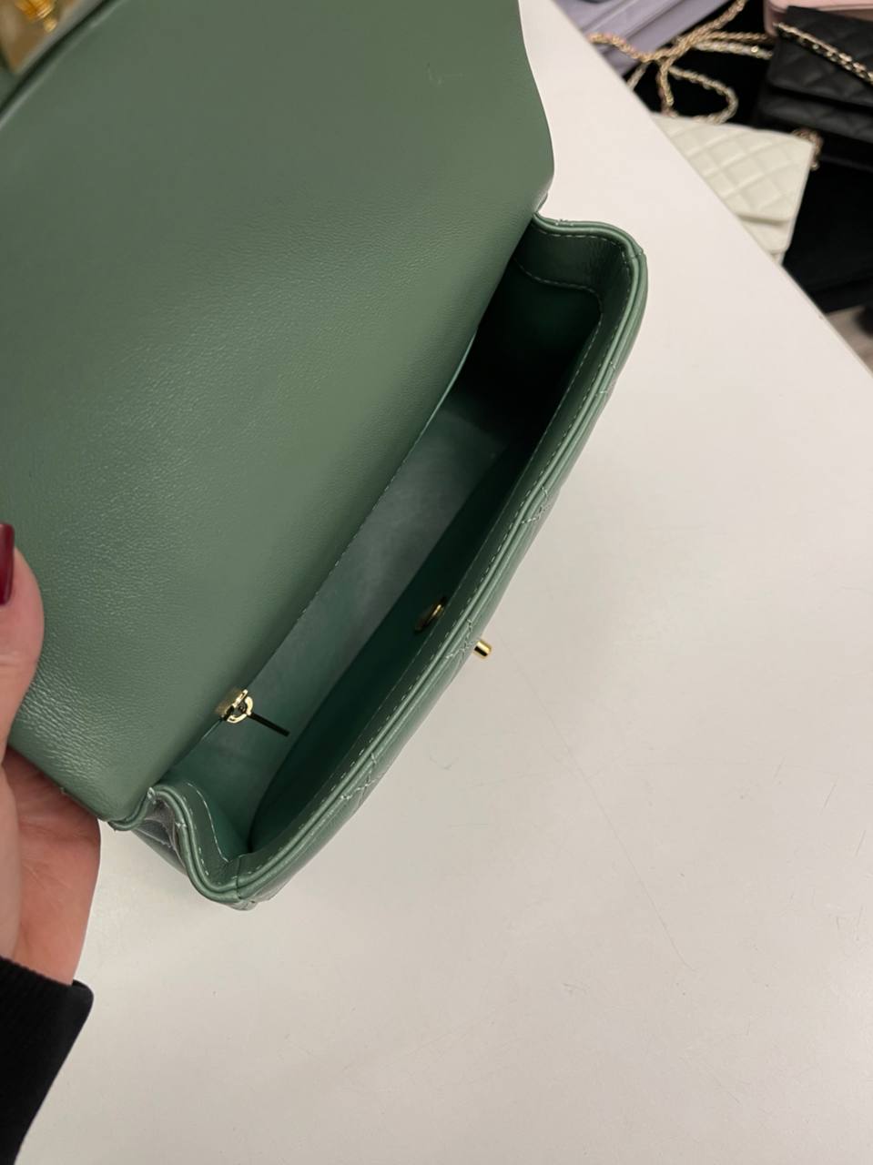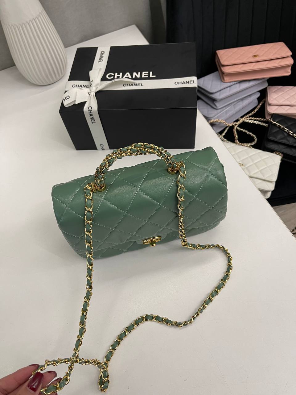 Сумка женская Chanel LUX-115364 - это элегантный аксессуар от известного бренда. Зеленый цвет сумки подчеркивает ее изысканный стиль. Она имеет стеганую текстуру и золотую цепочку, что делает её идеальным вариантом для повседневного использования и особых случаев.