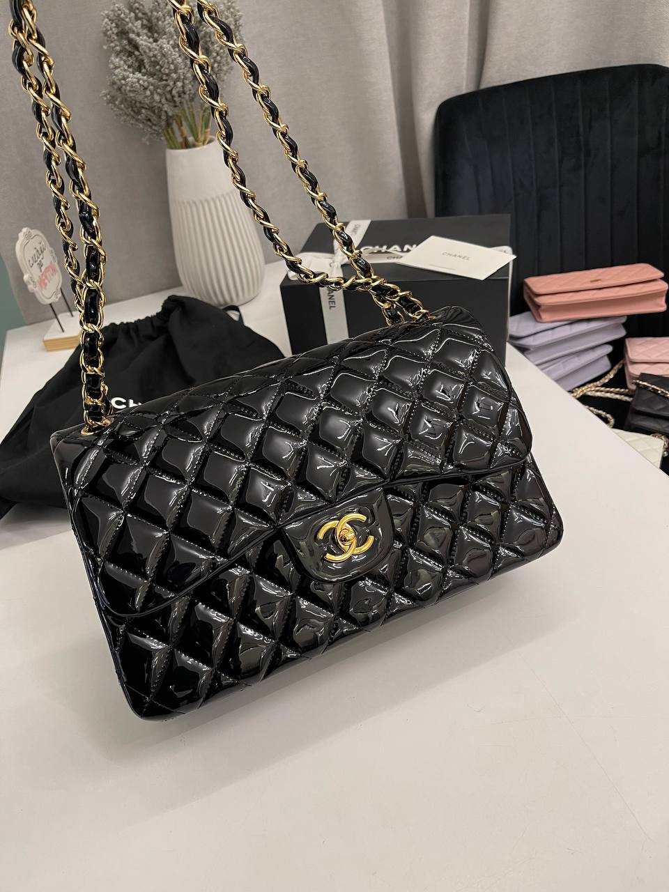 Сумка женская Chanel LUX-115365, выполнена в классическом стиле бренда. Сумка прямоугольной формы, черного цвета с глянцевой текстурой, имеет стеганый узор и золотистую фурнитуру. Идеально подходит для повседневного использования, а также для особых случаев.