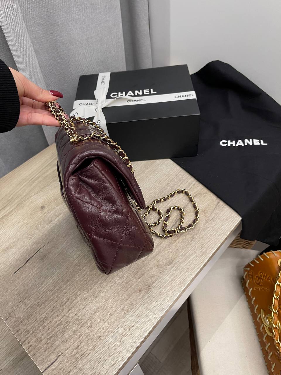 Сумка женская Chanel LUX-115383 представляет собой классическую модель в бордовом цвете. Дизайн сумки выполнен в стиле стеганой кожи с золотистой цепочкой. Она подойдет для повседневного использования и особых случаев.