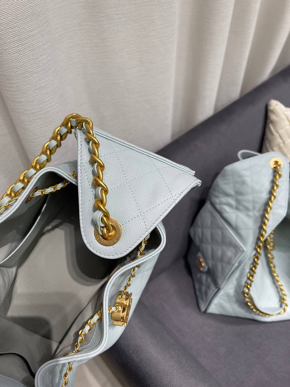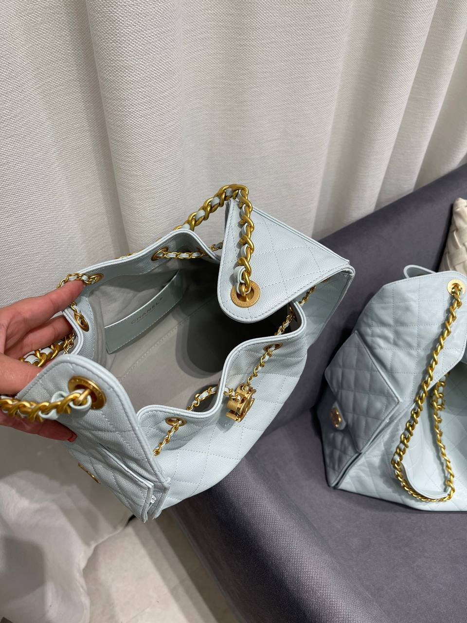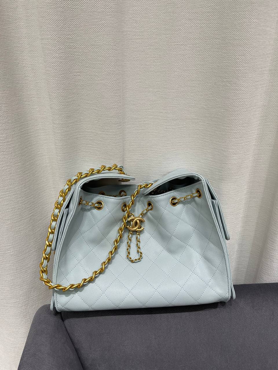 Сумка женская 25, Small Chanel LUX-118811 - это стильный аксессуар от известного бренда. Сумка выполнена в нежно-голубом цвете, имеет ромбовидную стежку, придающую ей элегантный вид. Она идеально подойдет для создания изысканного образа.
