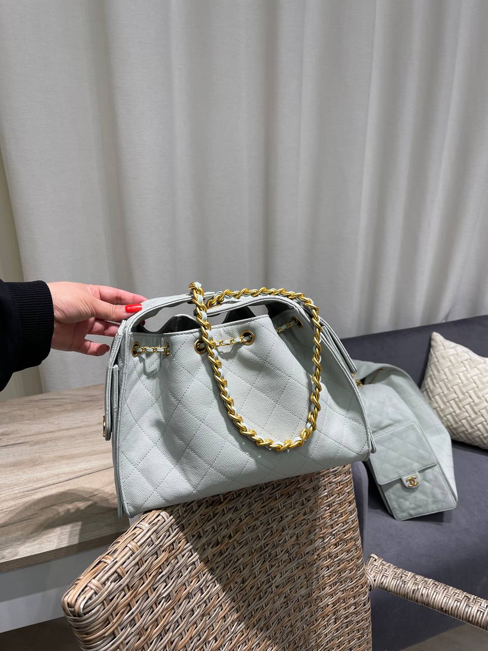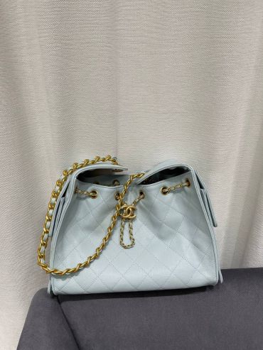Сумка женская 25, Small Chanel LUX-118813 выполнена в классическом стиле. Она имеет форму ведра и украшена стеганым узором. Сумка выполнена в нежном голубом цвете, с золотистой цепочкой, что делает ее элегантной и подходящей для различных образов.