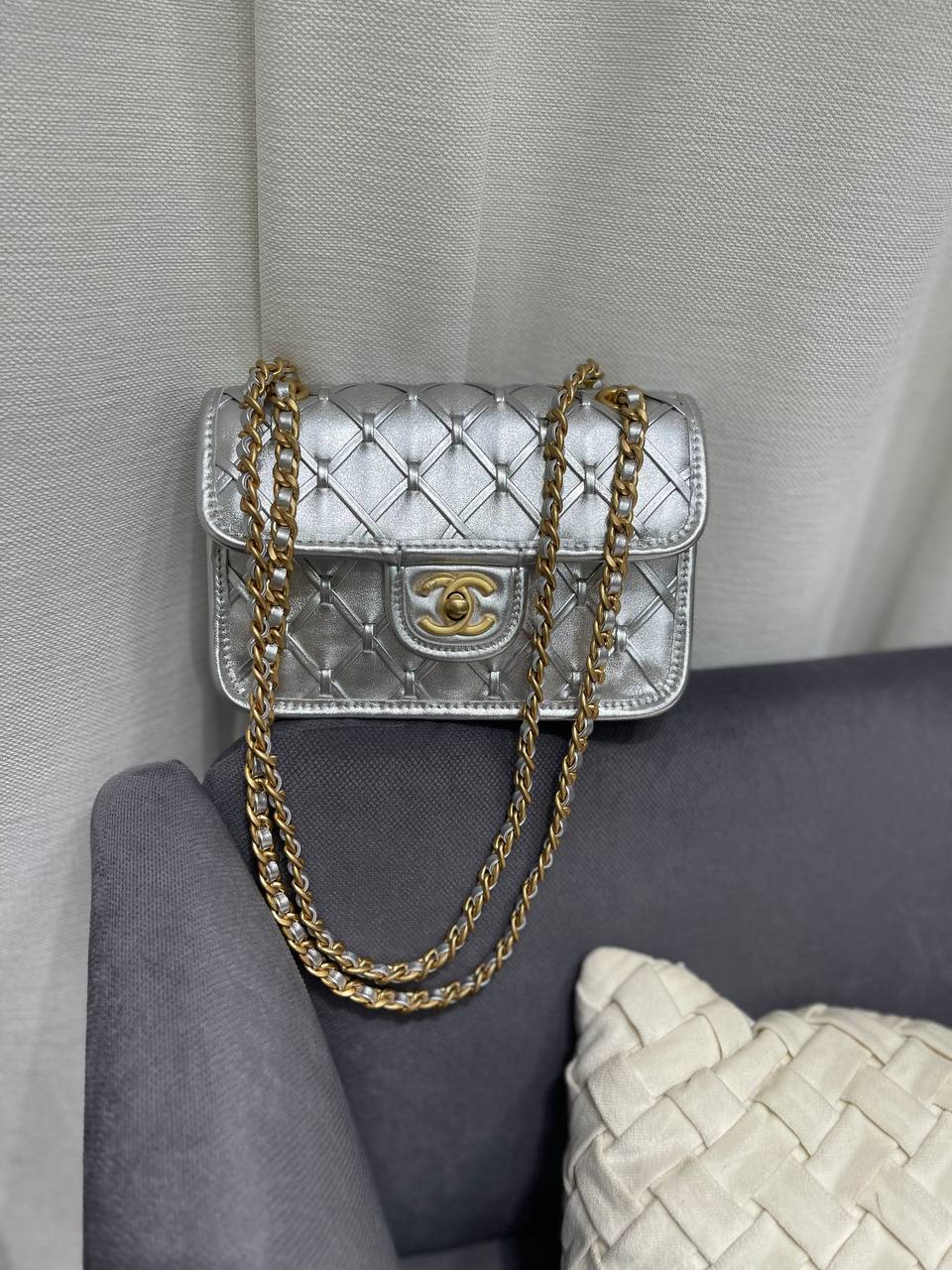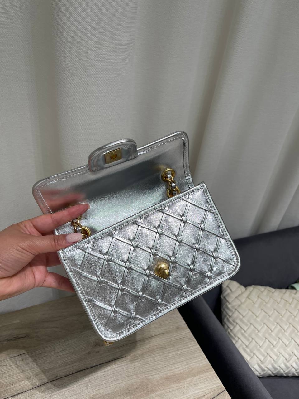 Сумка женская Chanel LUX-120056 - это элегантная сумочка, выполненная в фирменном стиле бренда. Серебристый цвет с ромбовидной стежкой придает изделию изысканный вид. Сумка идеально подходит для создания неповторимого образа.