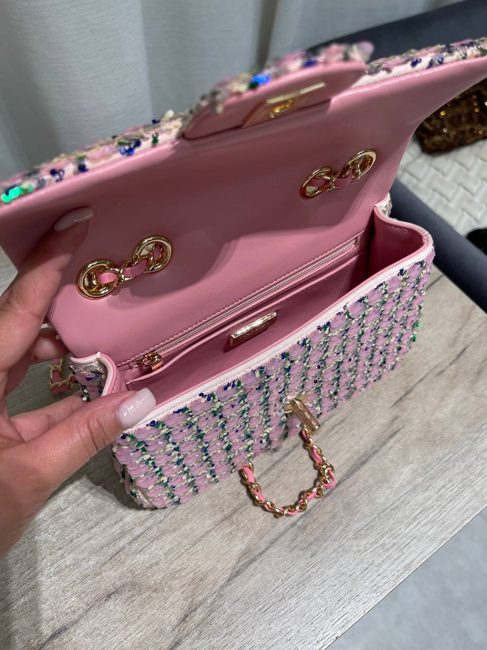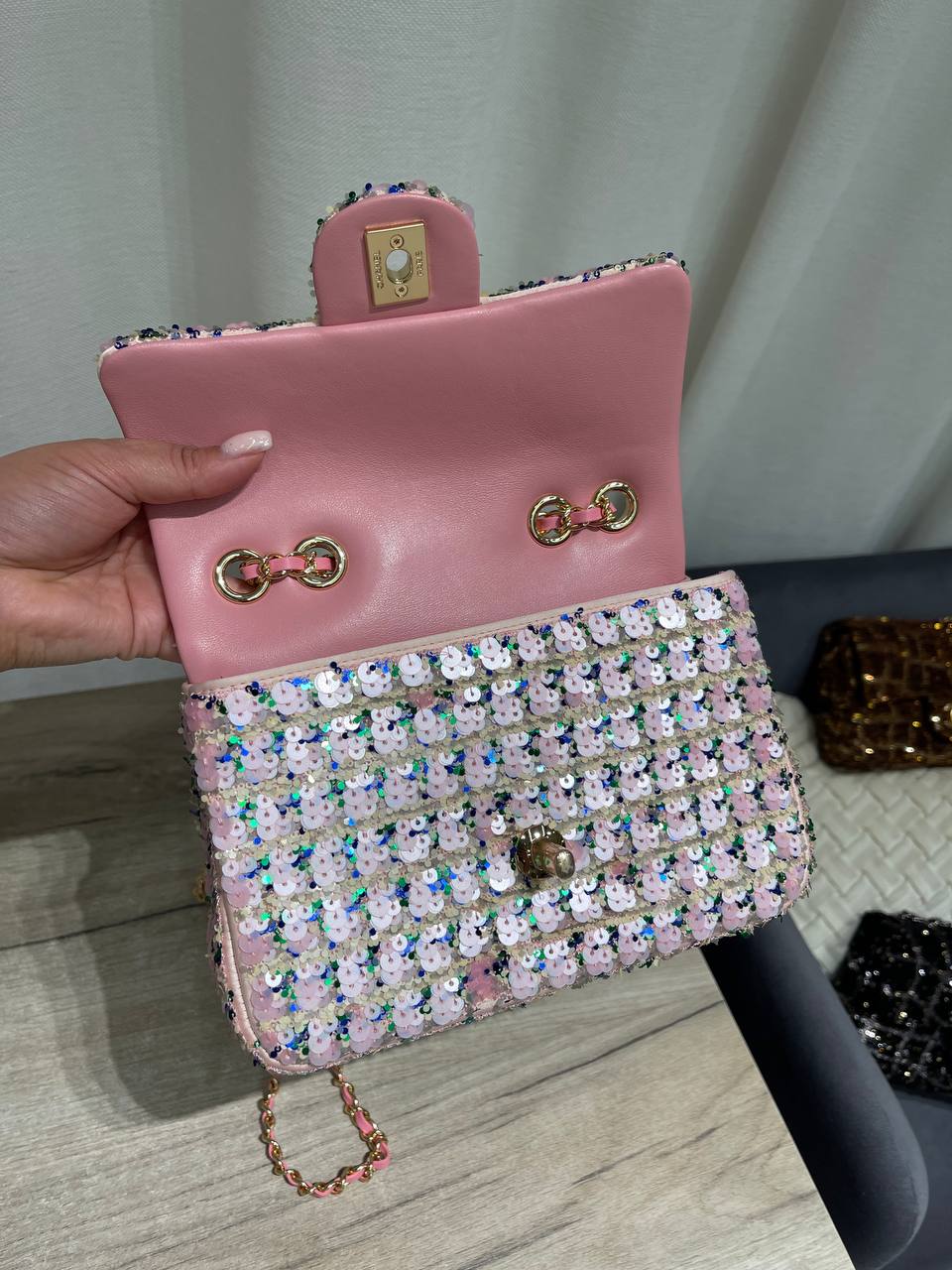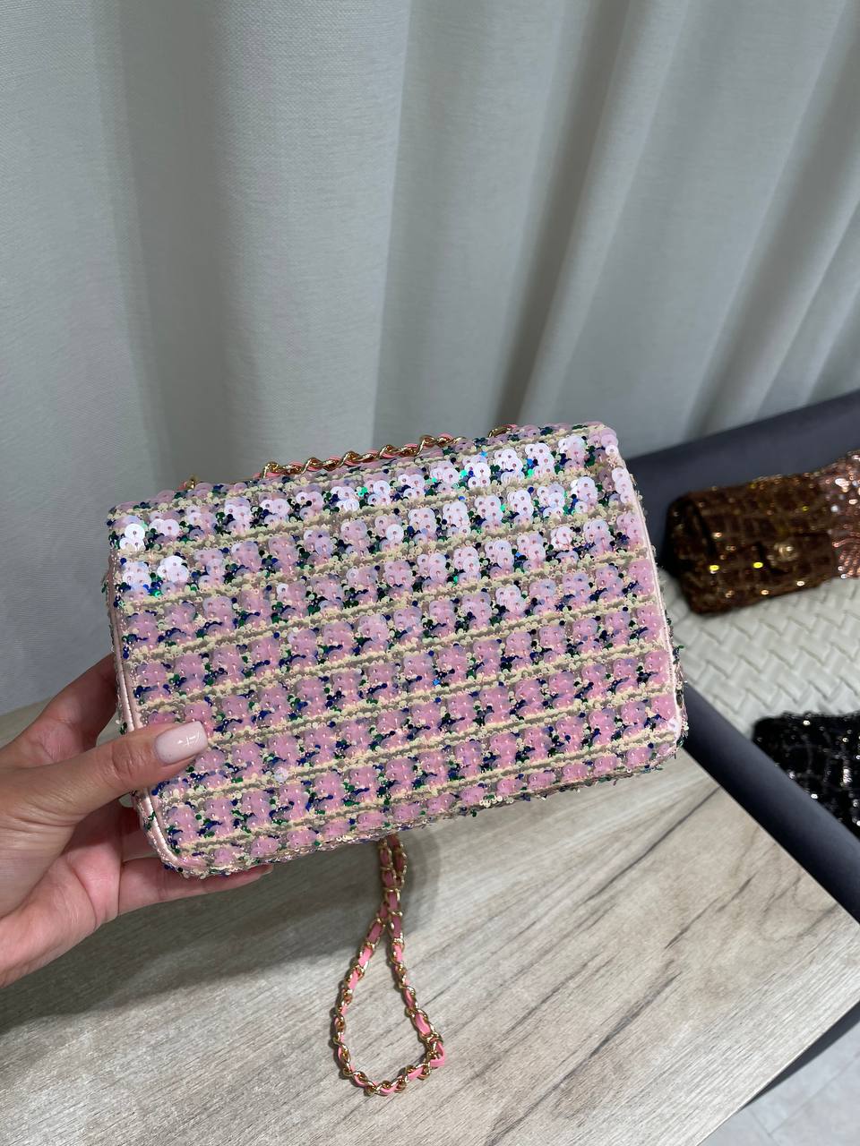 Сумка женская Chanel LUX-120102 — это воплощение элегантности и роскоши. Она выполнена в розовом цвете с мерцающими пайетками, что придает ей изысканный вид. Эта сумка идеально подходит для создания неповторимого образа.