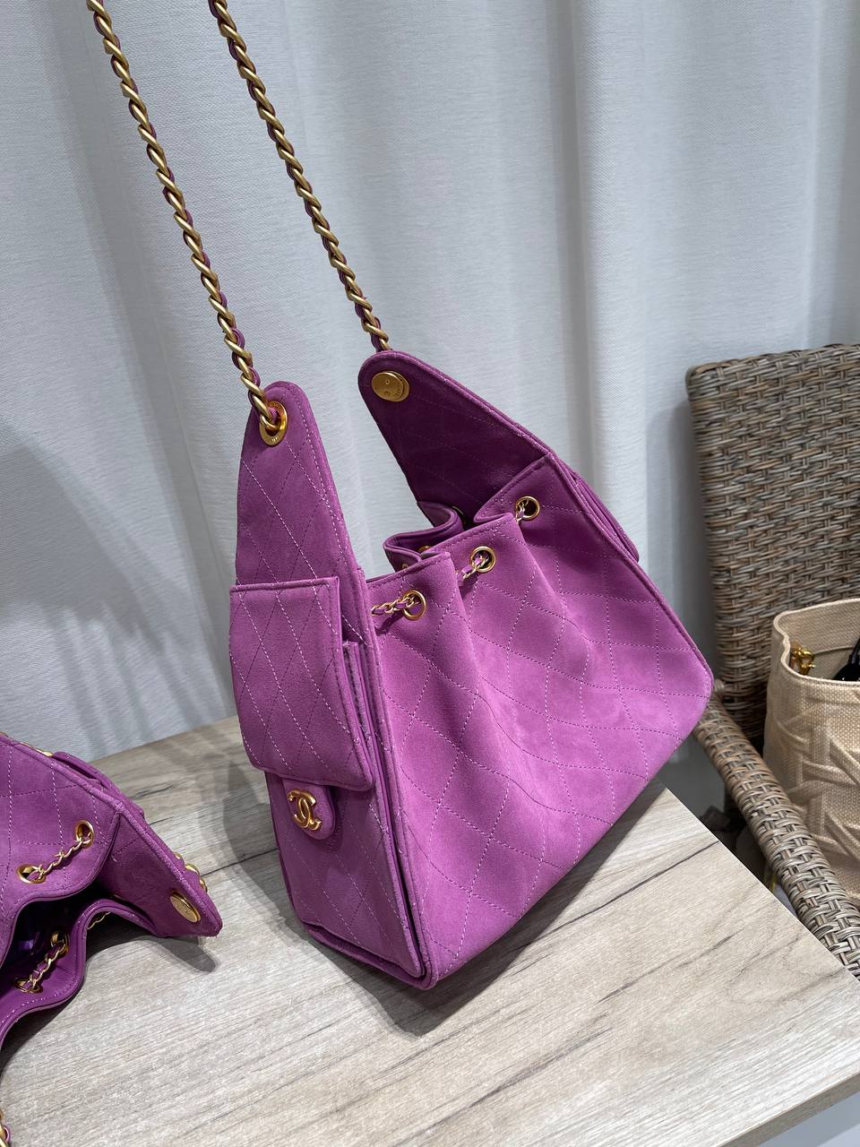 Женская сумка Chanel 25 Small LUX-121745 – это элегантный аксессуар, сочетающий в себе классический стиль и современные тенденции. Сумка выполнена в привлекательном фиолетовом цвете с изящной золотой цепочкой.