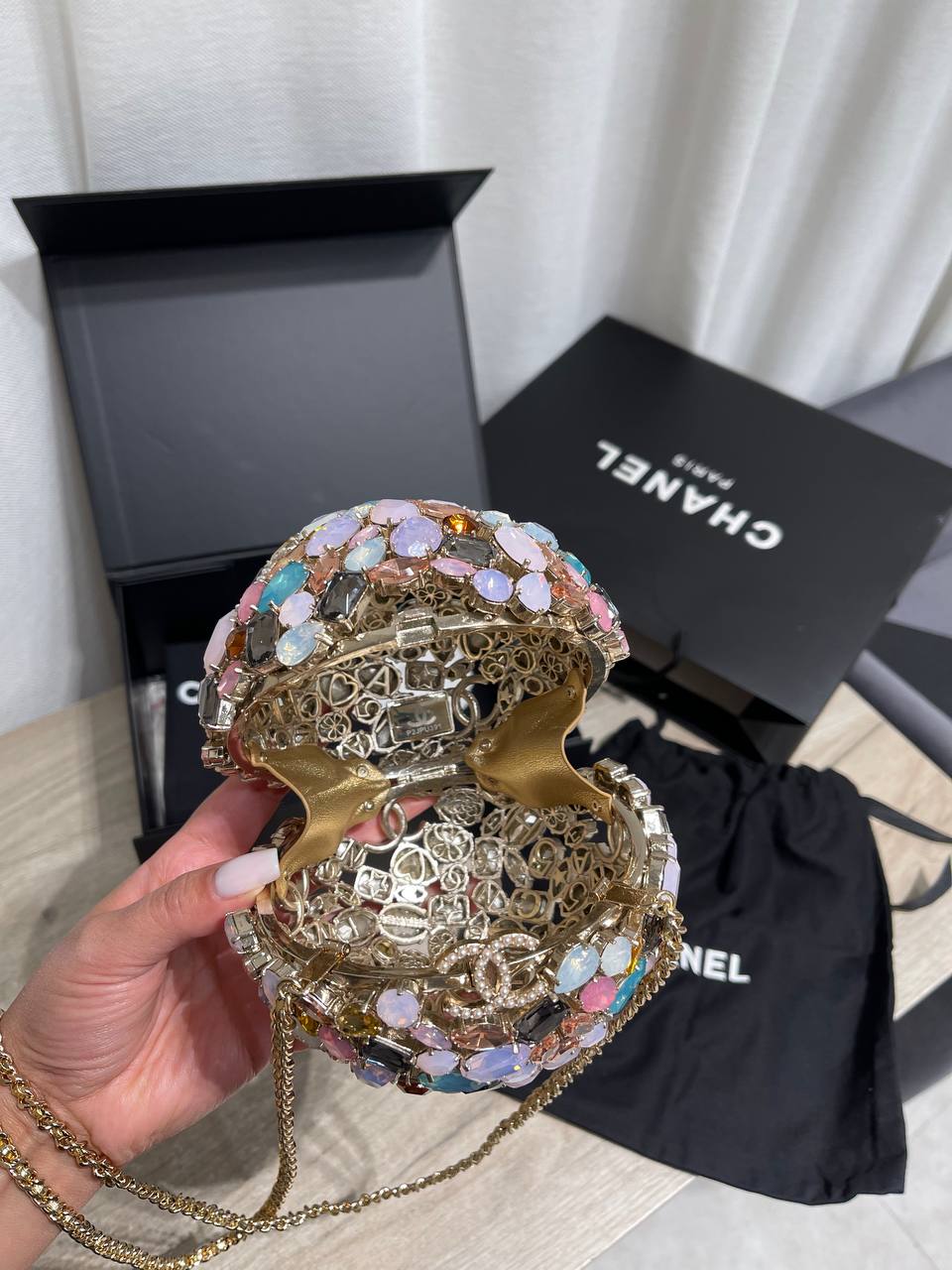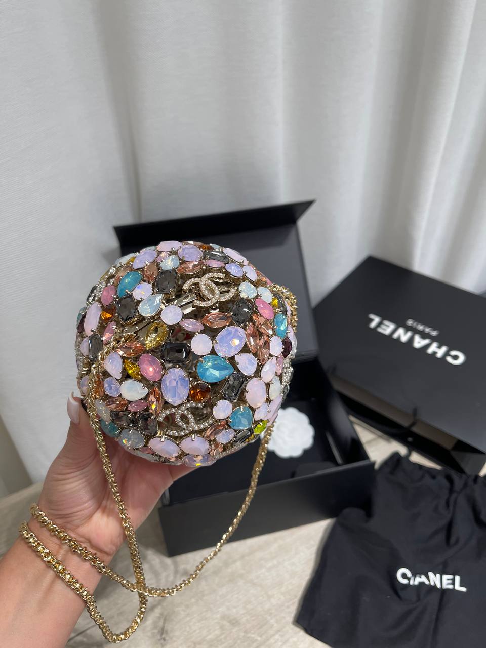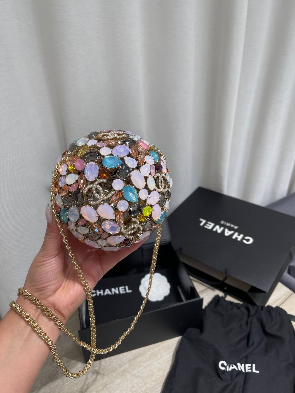 Сумка Chanel - это уникальный аксессуар, сочетающий в себе смелый дизайн и неповторимый стиль. Этот шарообразный клатч, декорированный разноцветными камнями, станет ярким акцентом в вашем образе.