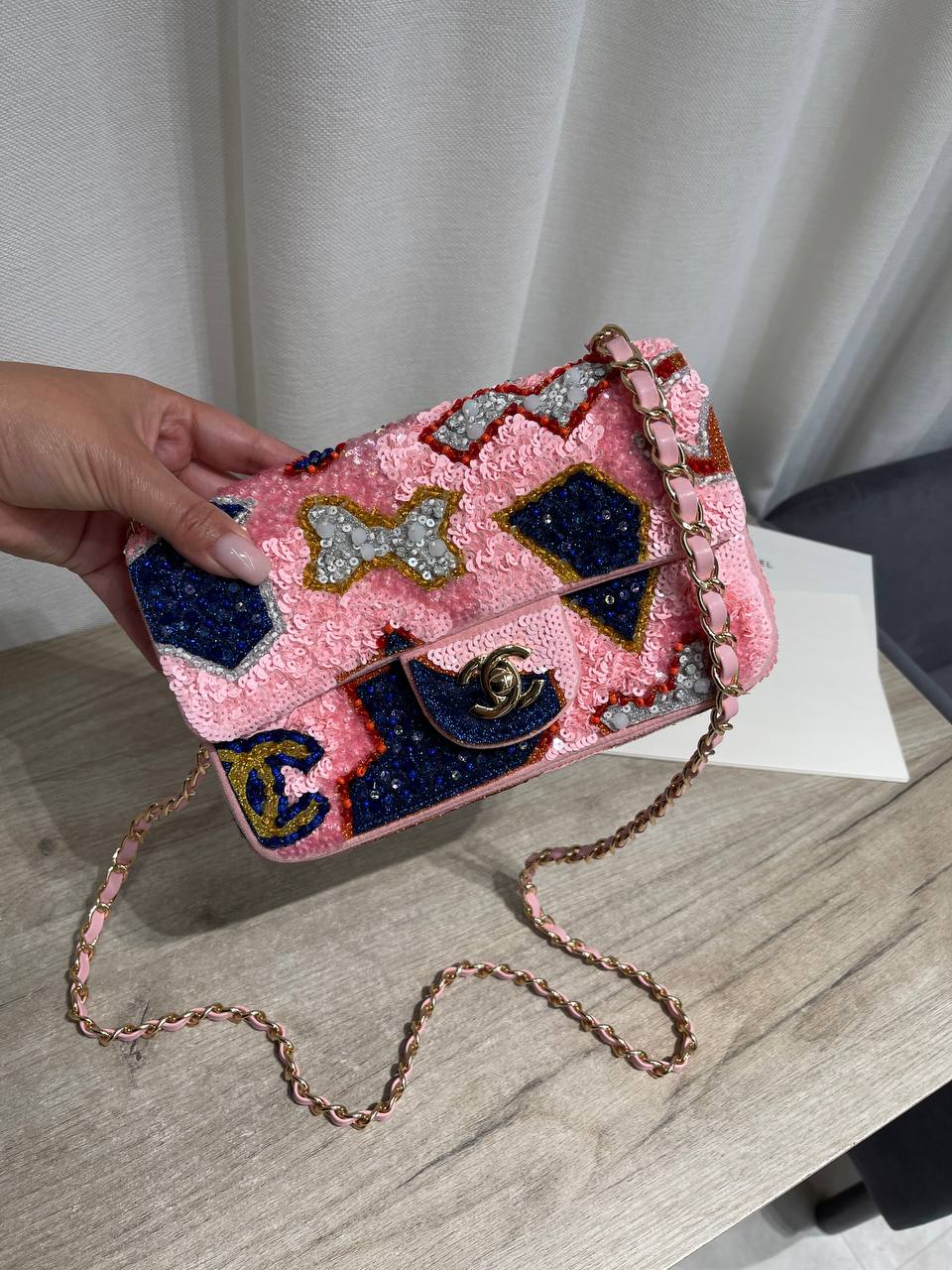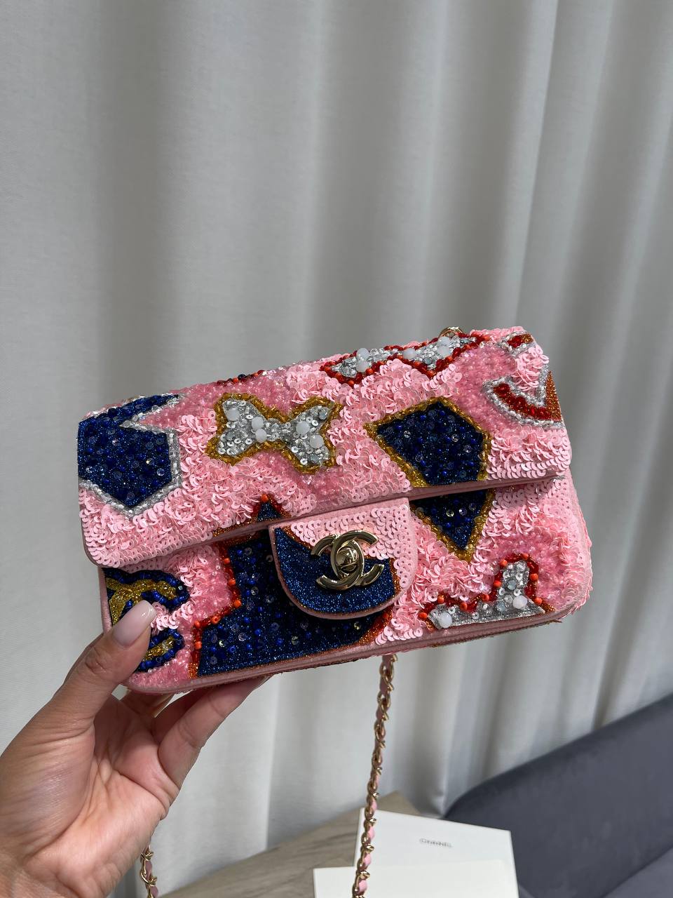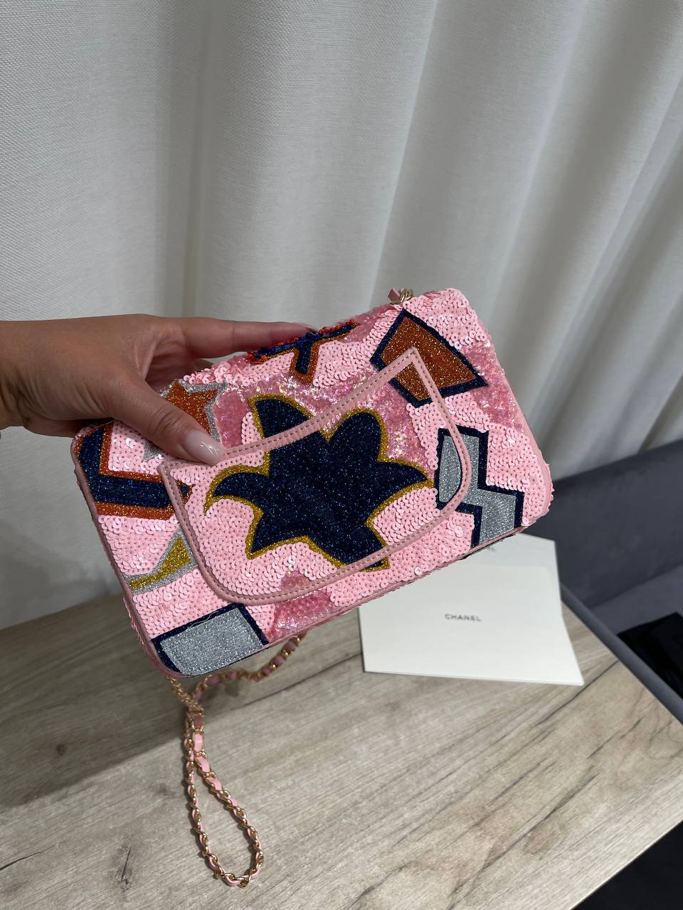 Эта женская сумка от Chanel – воплощение элегантности и изысканности. Сумка LUX-124380, украшенная пайетками, станет ярким акцентом в вашем образе, подчеркивая ваш безупречный вкус.